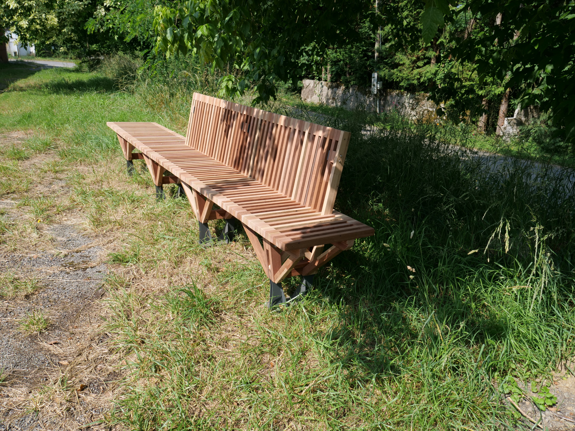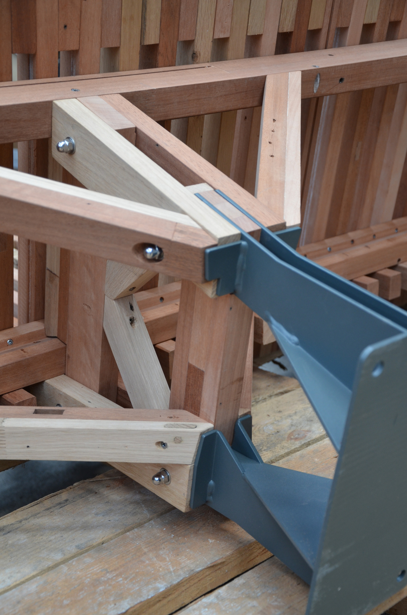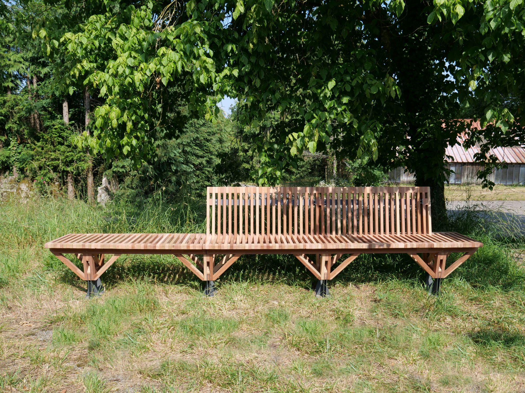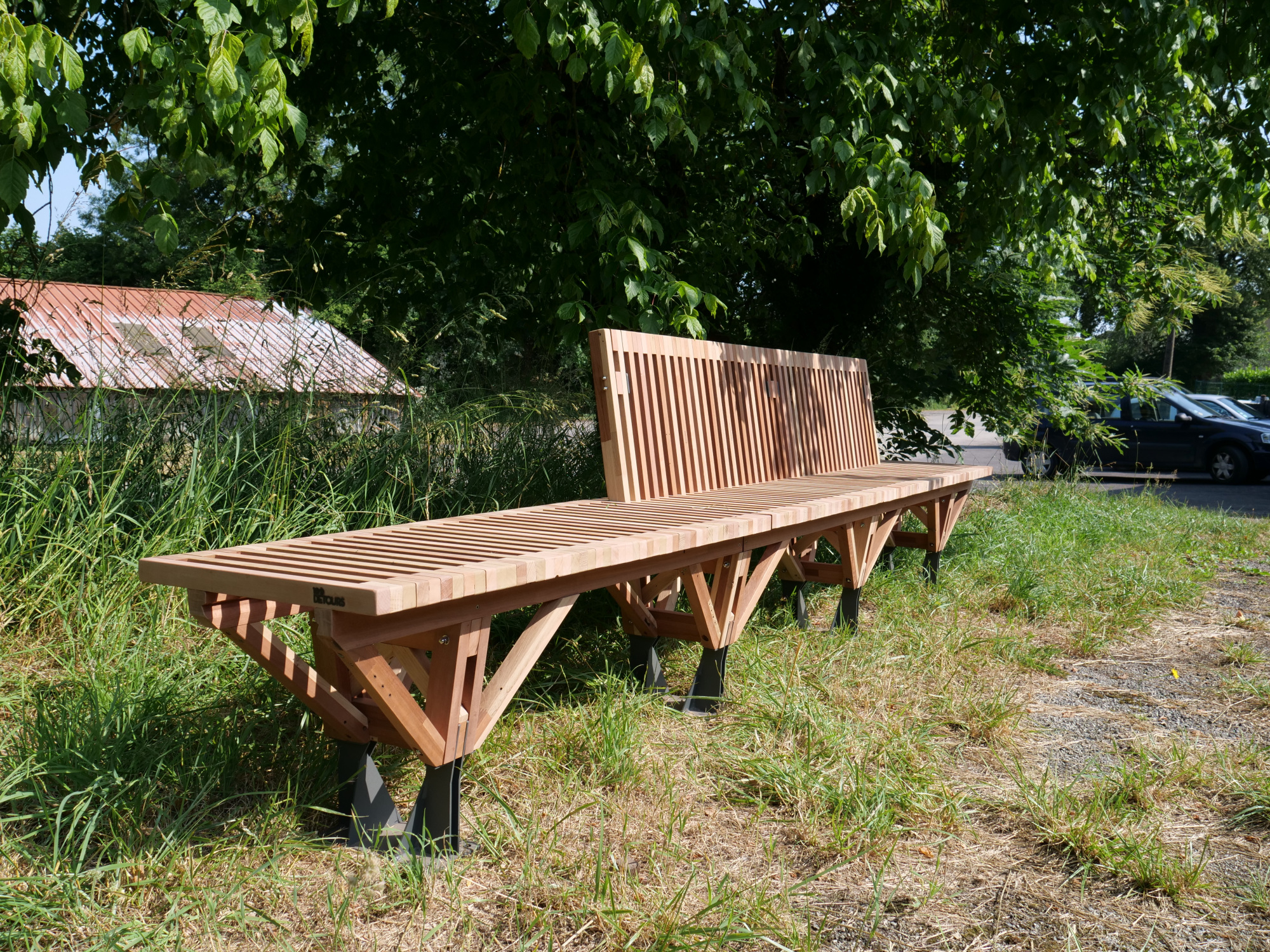 Le banc EBa01 est intégralement fabriqué en chêne et bois tropical réutilisé, de classe d’emploi 3 et 4 provenant d’anciennes menuiseries. Il est constitué de battants de fenêtres de section 28 x 40 mm corroyés et liés entre eux. Les battants sont fixés sur une ossature arborescente en bois lamellé-collé de section 40 x 70 mm, posée sur platines.