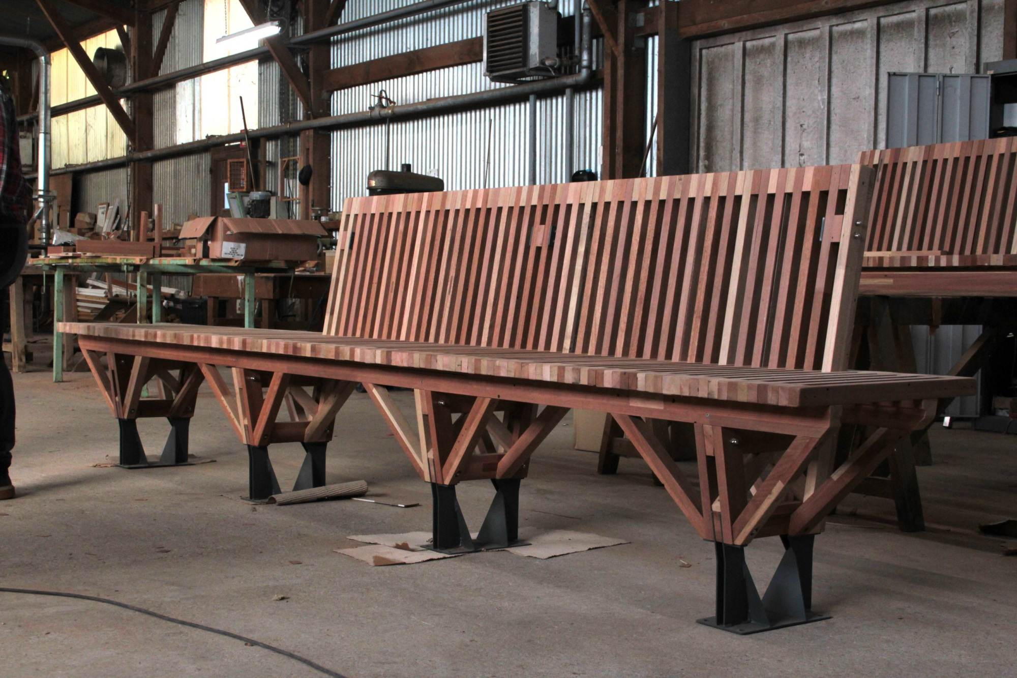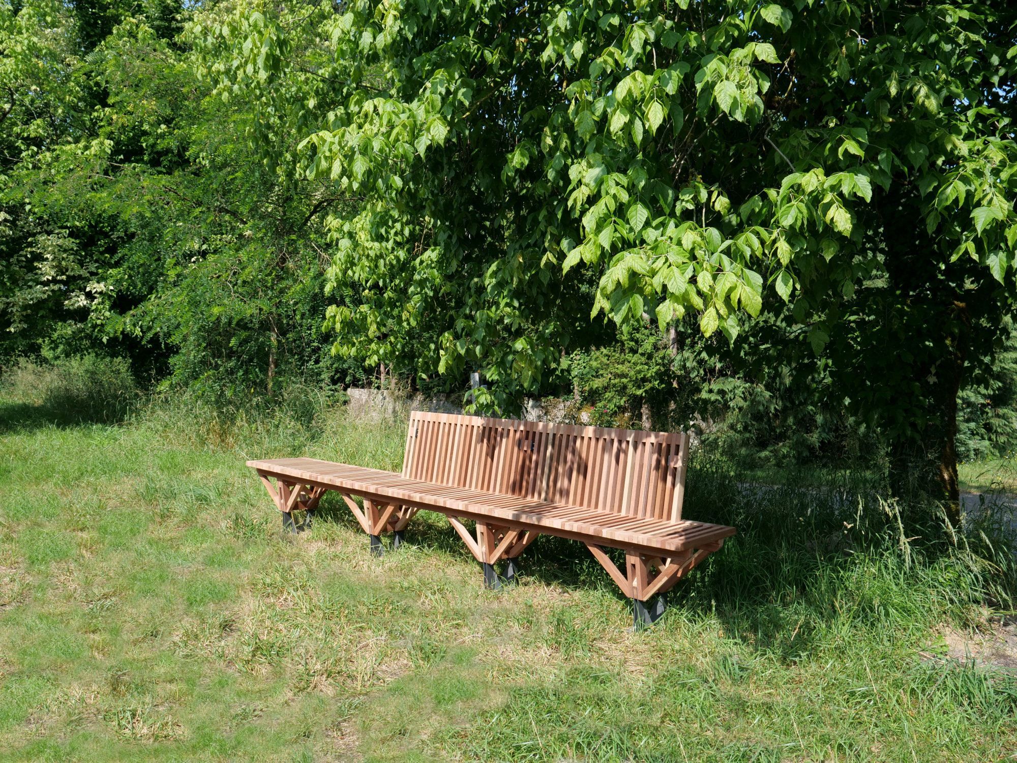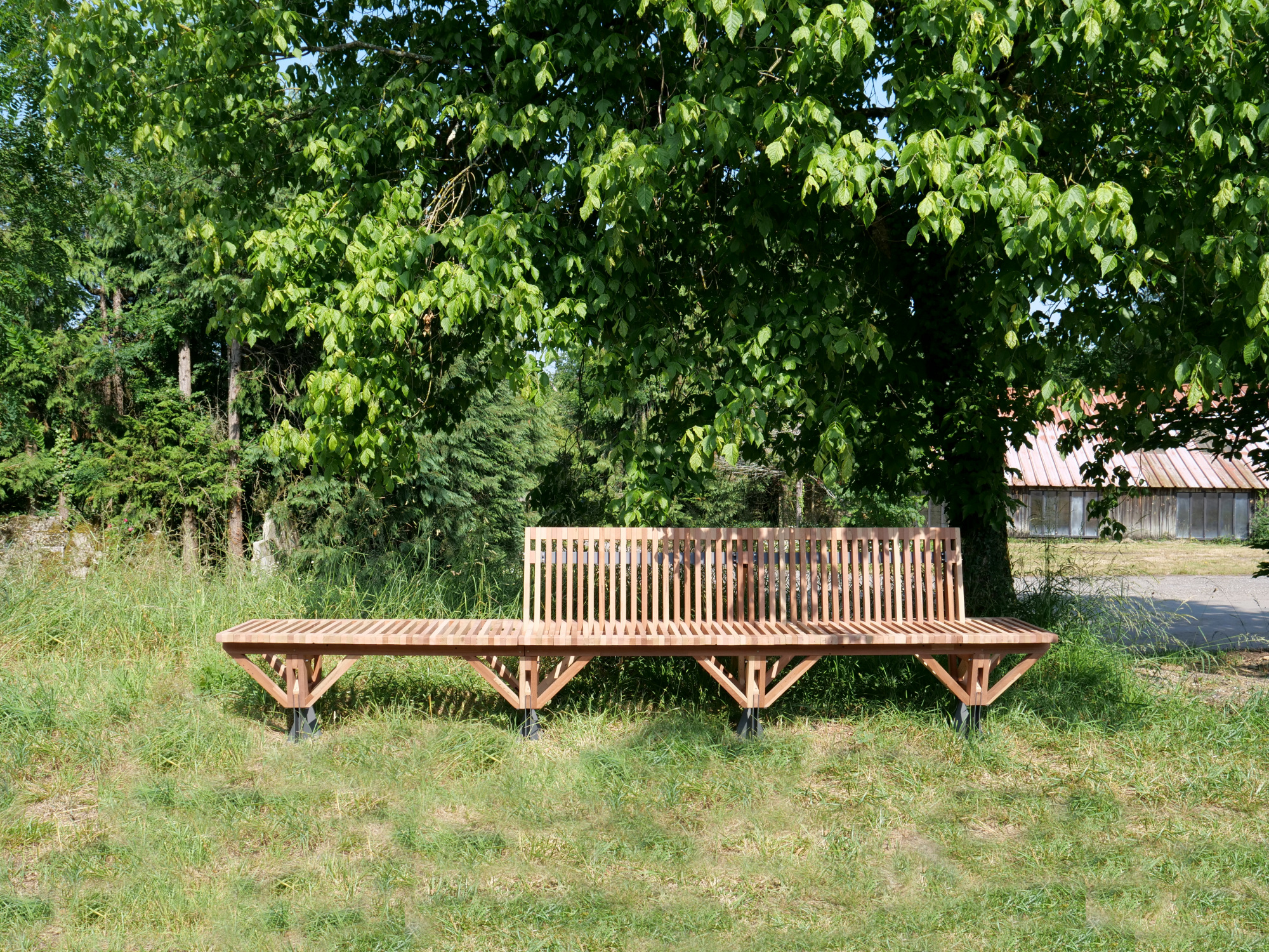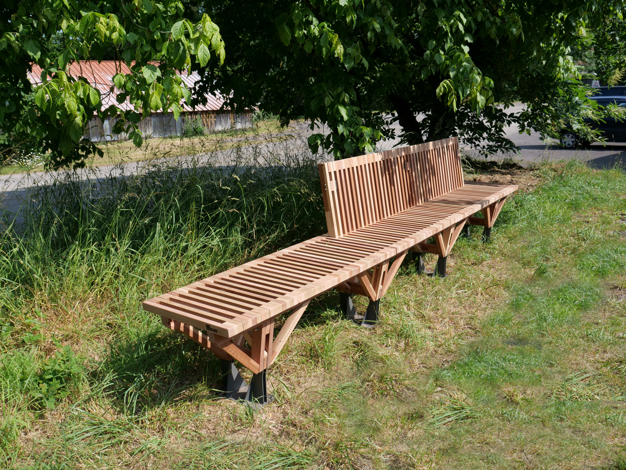 Le banc EBa01 est intégralement fabriqué en chêne et bois tropical réutilisé, de classe d’emploi 3 et 4 provenant d’anciennes menuiseries. Il est constitué de battants de fenêtres de section 28 x 40 mm corroyés et liés entre eux. Les battants sont fixés sur une ossature arborescente en bois lamellé-collé de section 40 x 70 mm, posée sur platines.