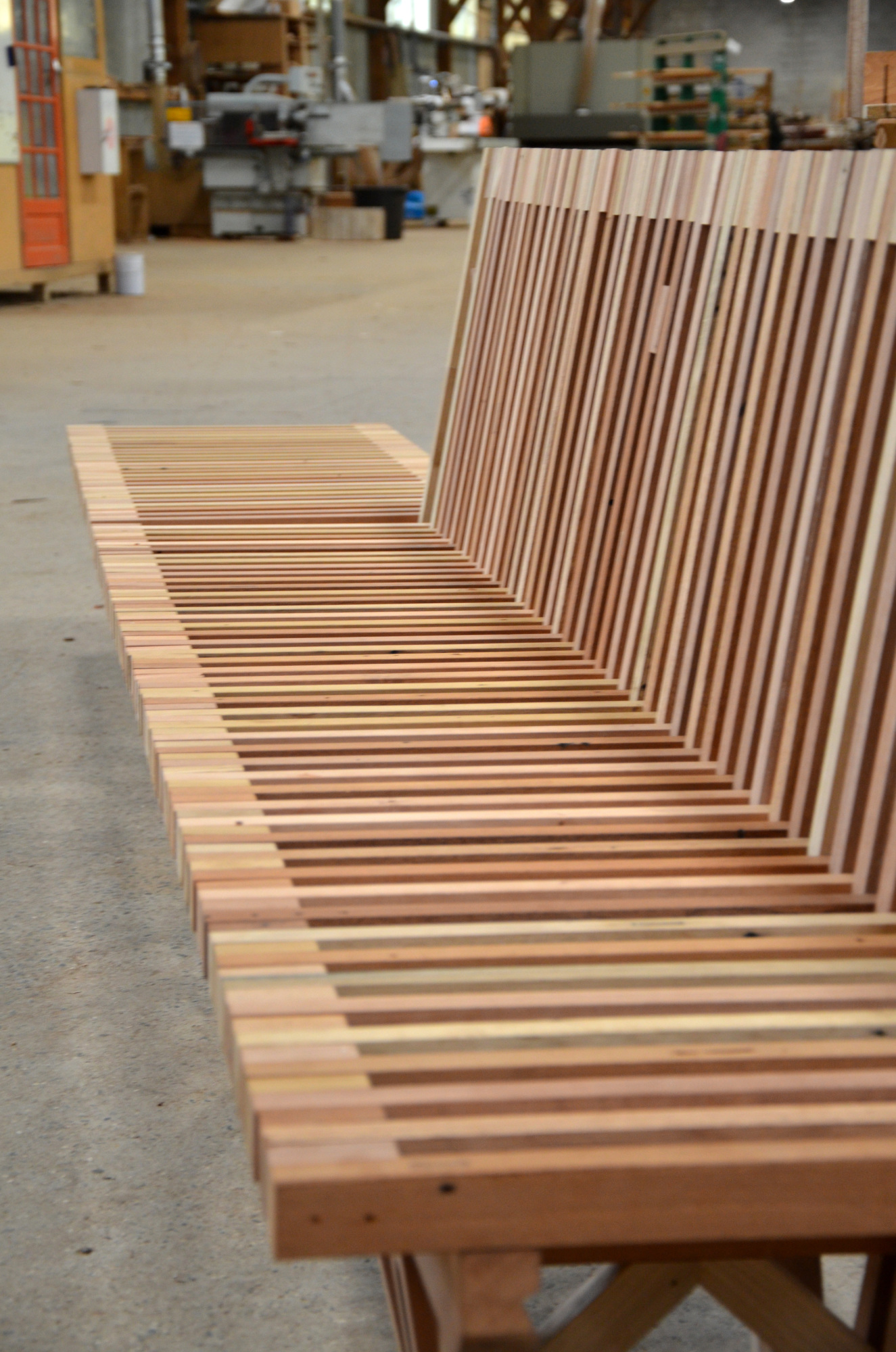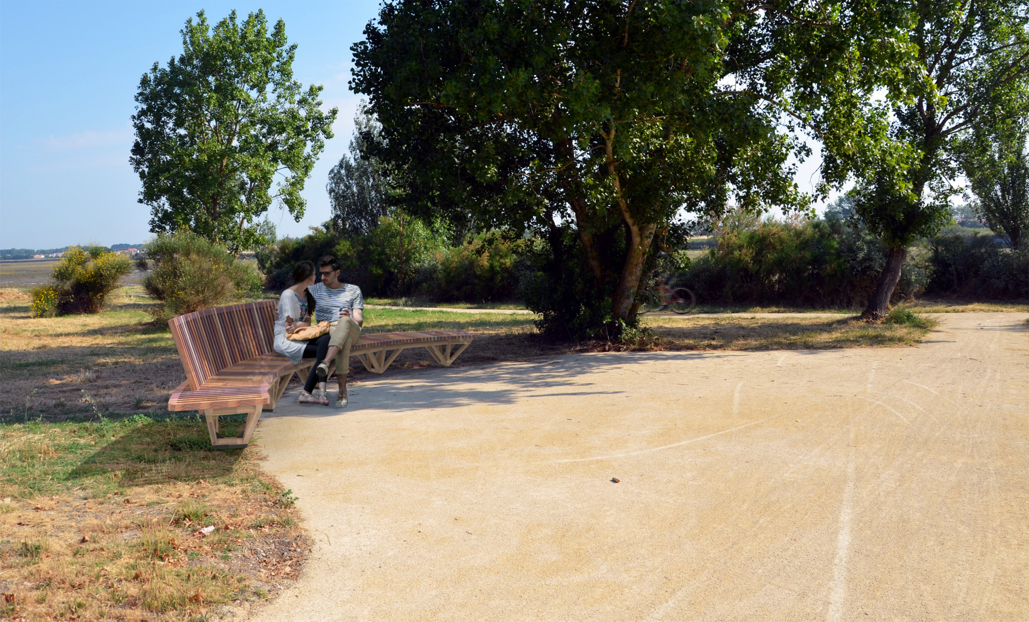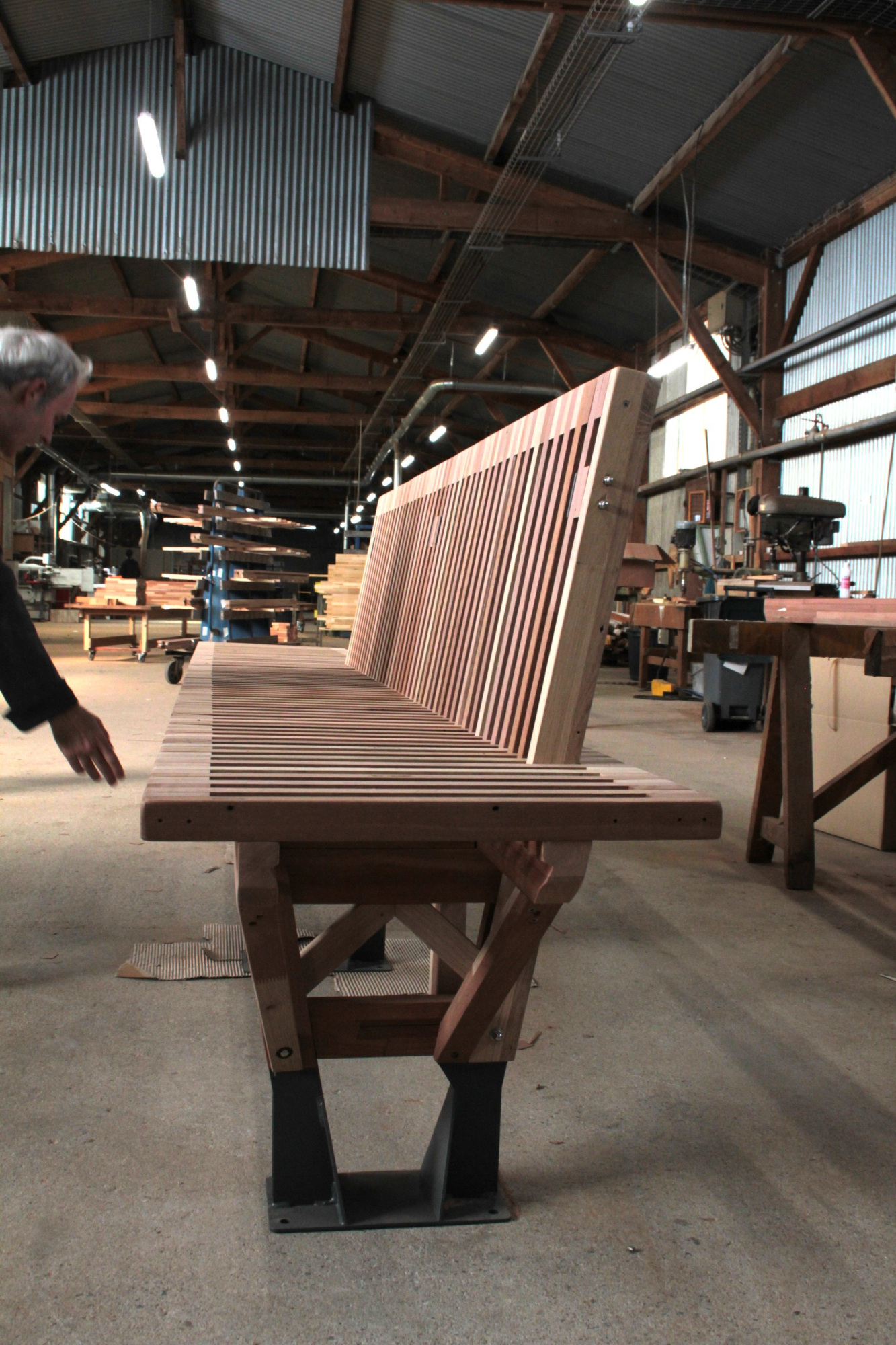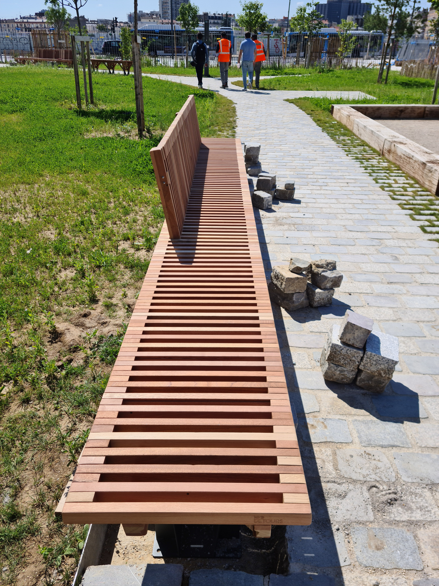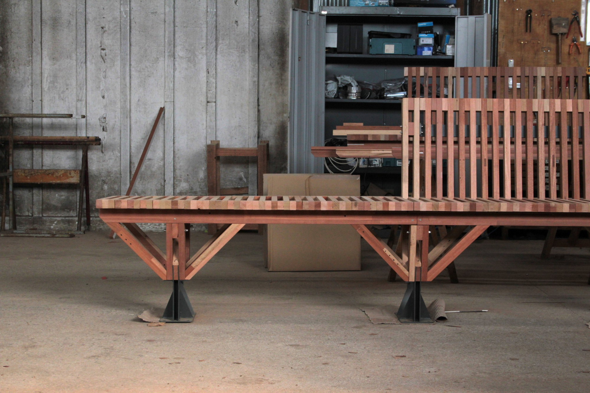 Le banc EBa01 est intégralement fabriqué en chêne et bois tropical réutilisé, de classe d’emploi 3 et 4 provenant d’anciennes menuiseries. Il est constitué de battants de fenêtres de section 28 x 40 mm corroyés et liés entre eux. Les battants sont fixés sur une ossature arborescente en bois lamellé-collé de section 40 x 70 mm, posée sur platines.