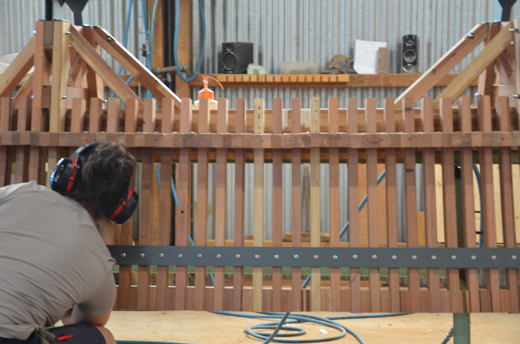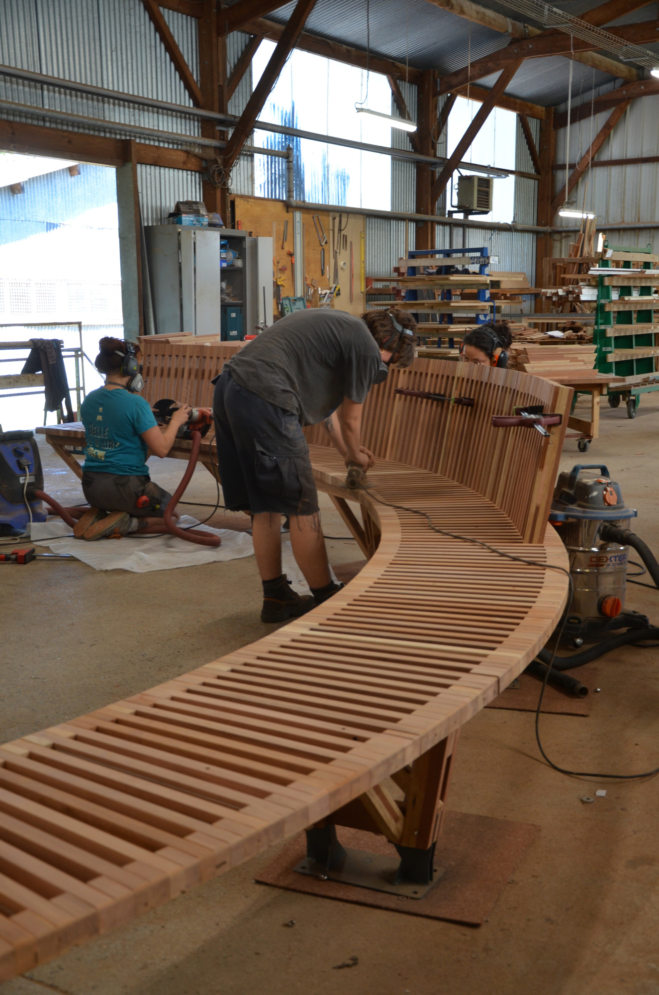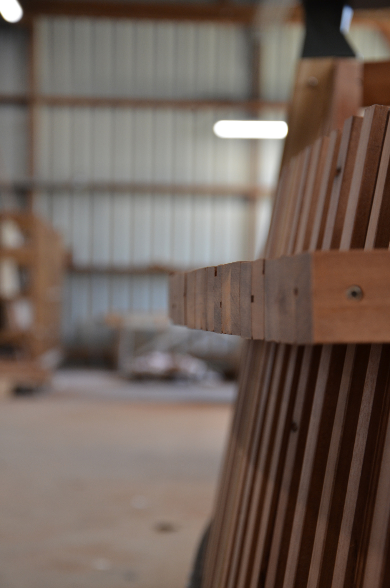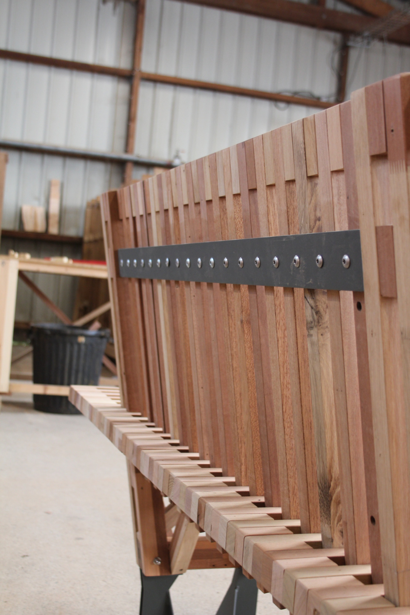 Le banc EBa01 est intégralement fabriqué en chêne et bois tropical réutilisé, de classe d’emploi 3 et 4 provenant d’anciennes menuiseries. Il est constitué de battants de fenêtres de section 28 x 40 mm corroyés et liés entre eux. Les battants sont fixés sur une ossature arborescente en bois lamellé-collé de section 40 x 70 mm, posée sur platines.