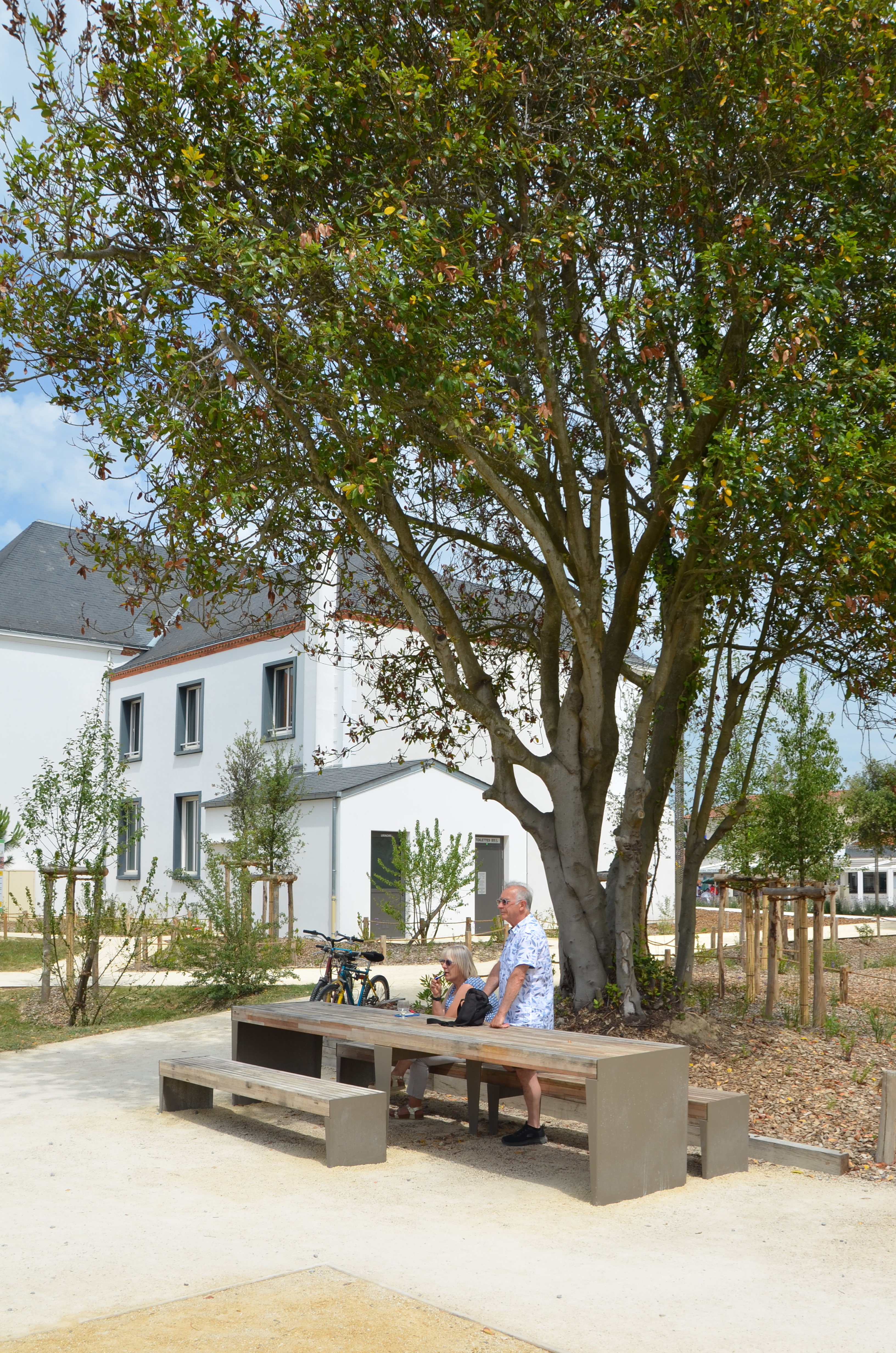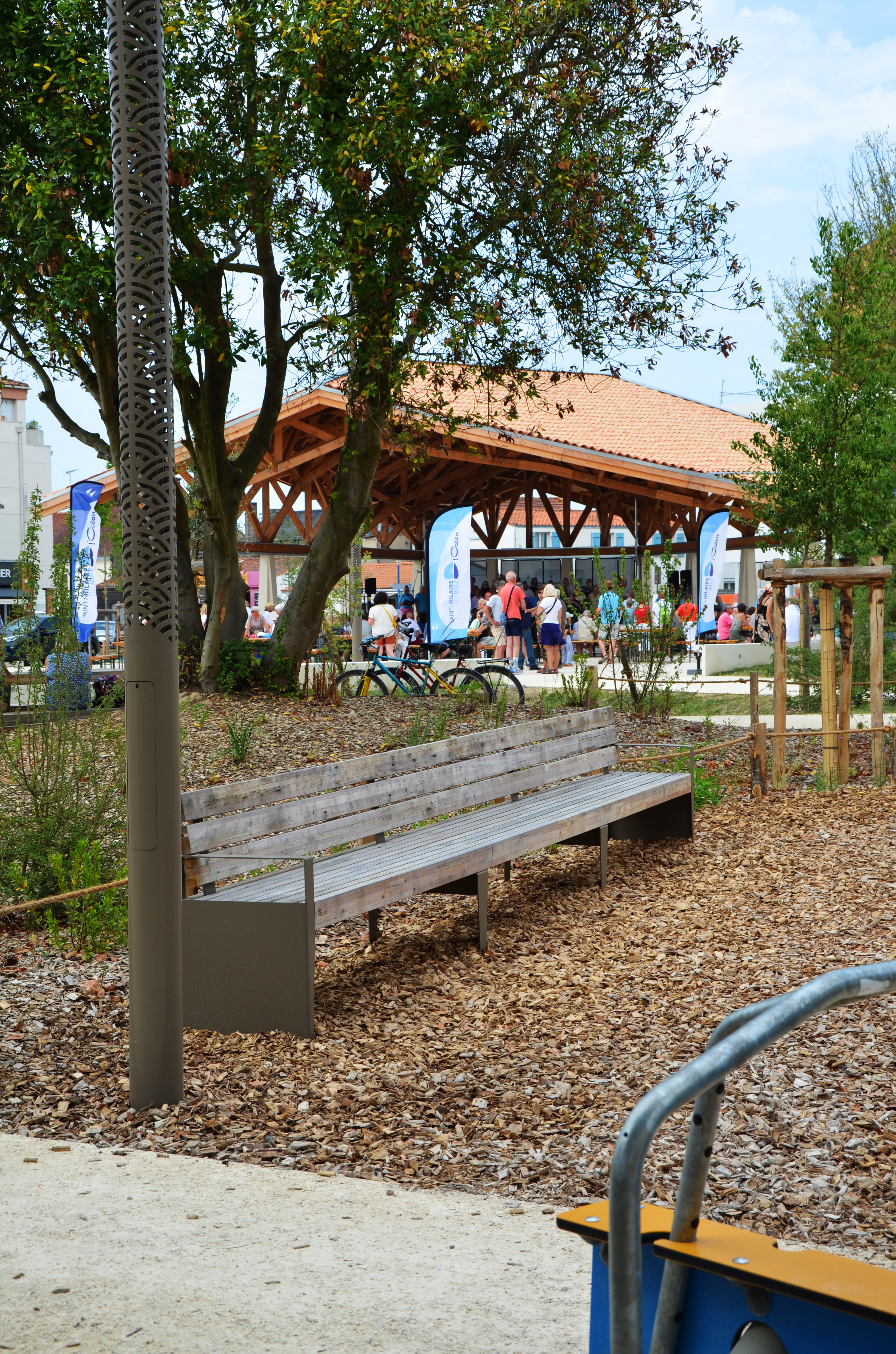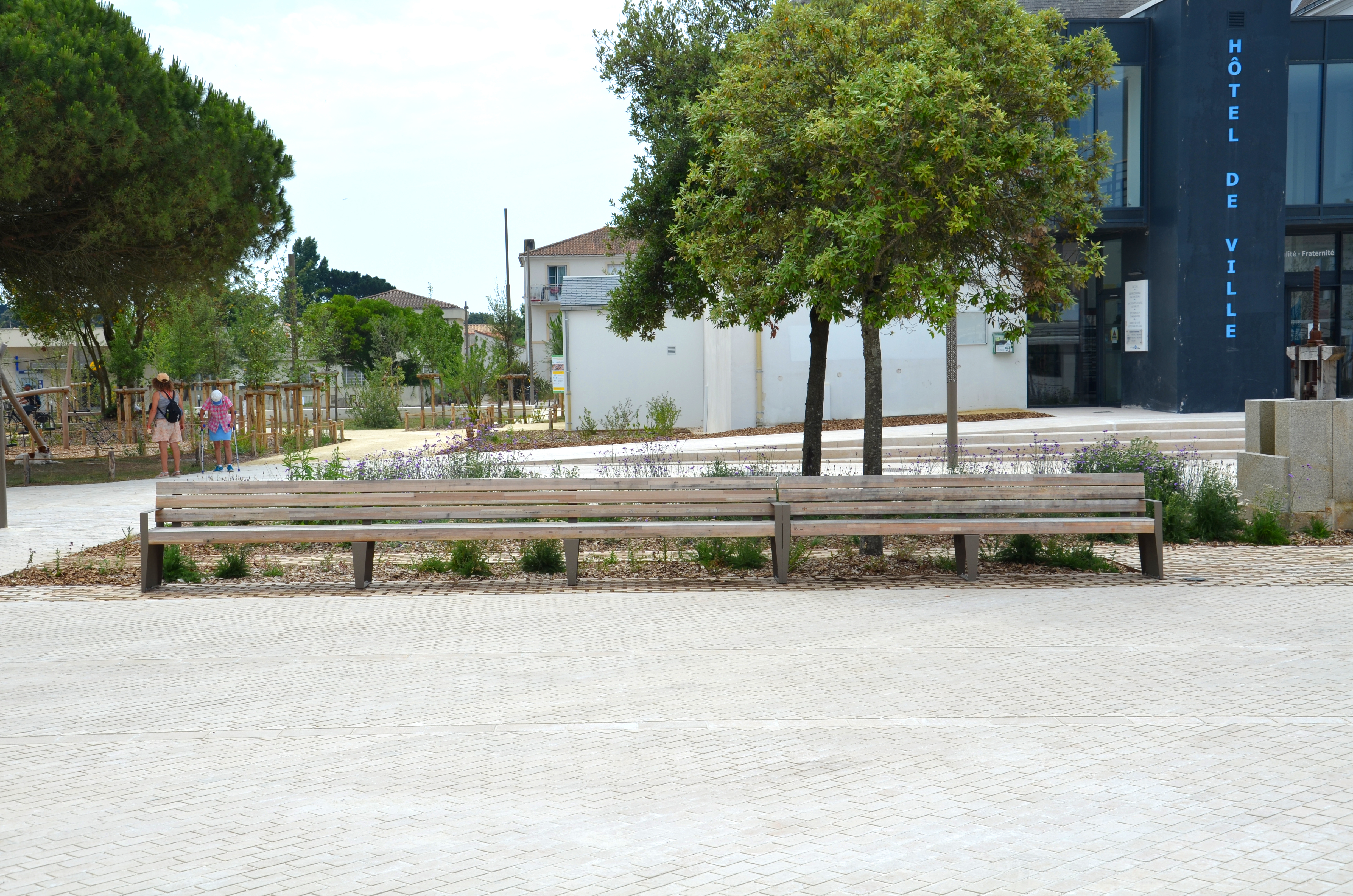 À l’occasion du réaménagement du cœur urbain de la ville de Saint-Hilaire-de-Riez, l’agence de paysagistes « D’ici-là » nous a mandaté pour concevoir et fabriquer plusieurs mobiliers urbains tels que la plateforme APl01, les bancs et les tables APa02. Ces mobiliers, fabriqués en bois d’anciennes fenêtres extérieures, répondent au renouvèlement d’une place dans l’ère du temps tout en étant durables et robustes. Leurs poutres en lamellé-colle de bois massif sont conçues pour résister aux intempéries.Ces ensembles de tables et de bancs, généreux par leur taille (3.5m de longueur), invitent à la convivialité et au partage entre les usagers, passants ou habitants de la commune.