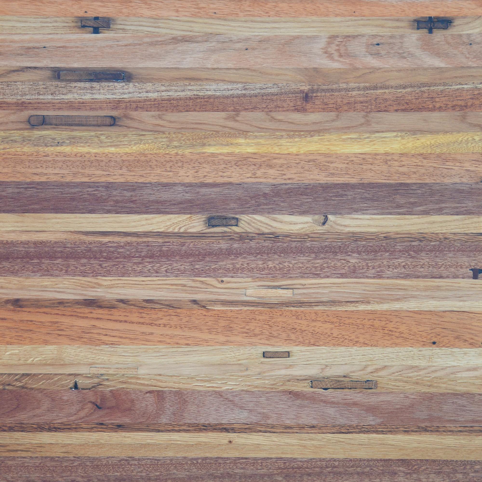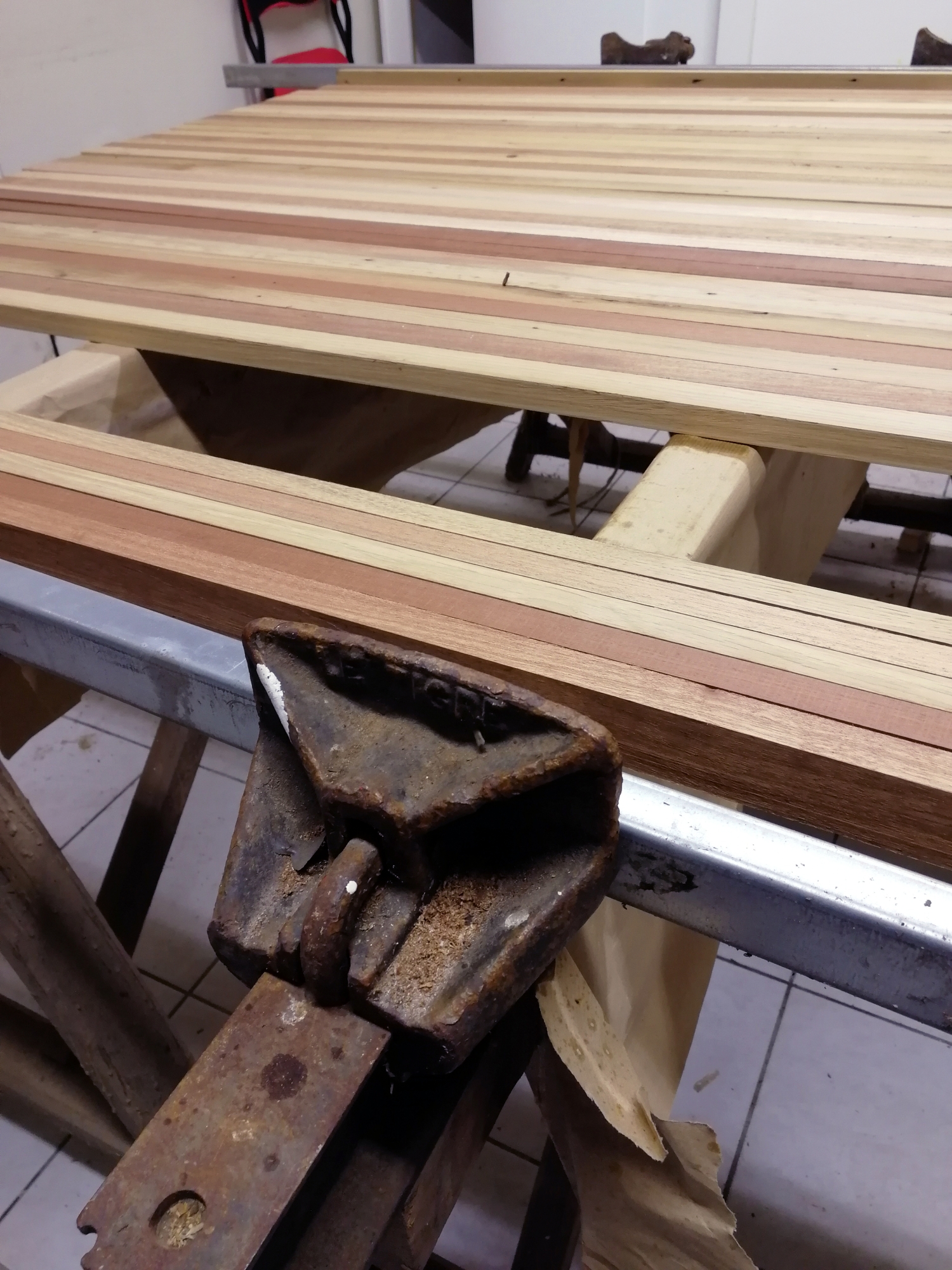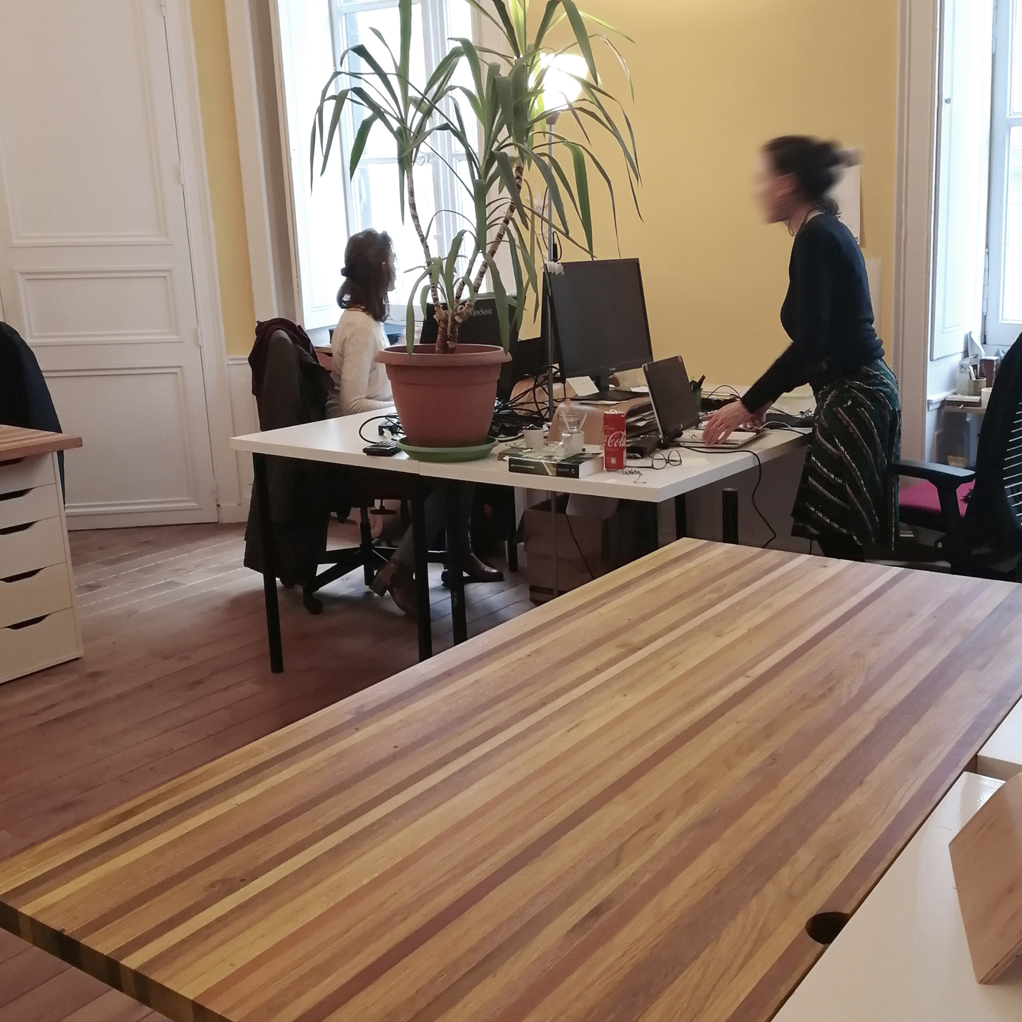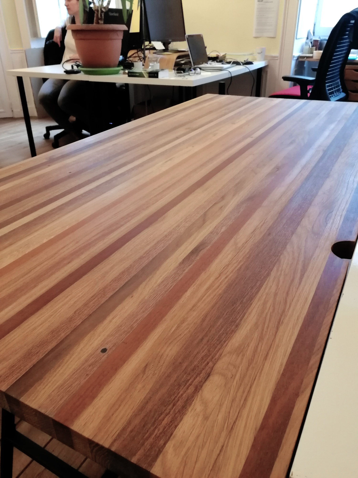 MPa01 Le mode de fabrication des panneaux en lamellé-collé permet d’utiliser des bois de différentes longueurs en les aboutant. Les tasseaux sont combinés en alternant les essences. Les plateaux en lamellés-collé peuvent être installés dans des bureaux, comme plans de travail de cuisine ou encore dans des salles de bain.