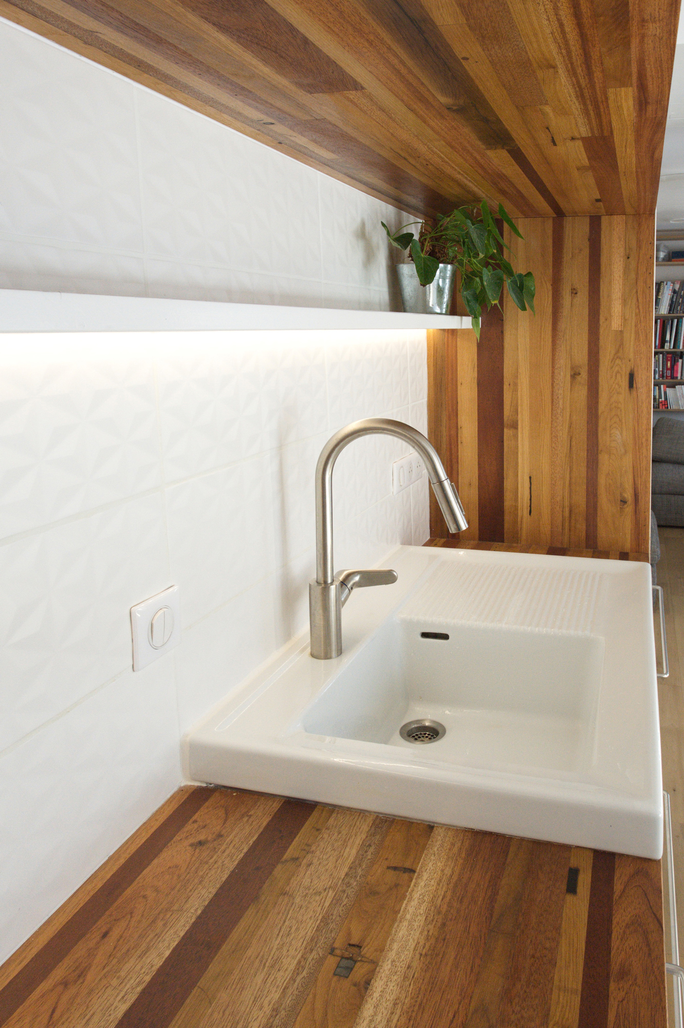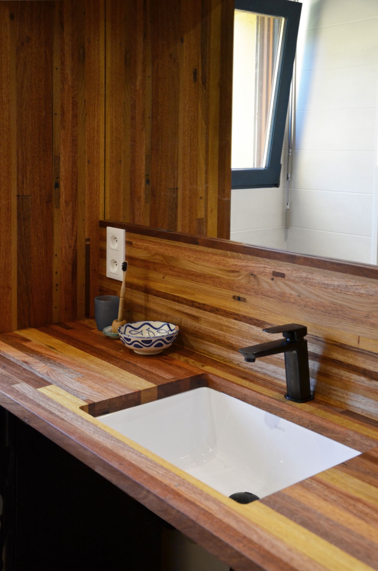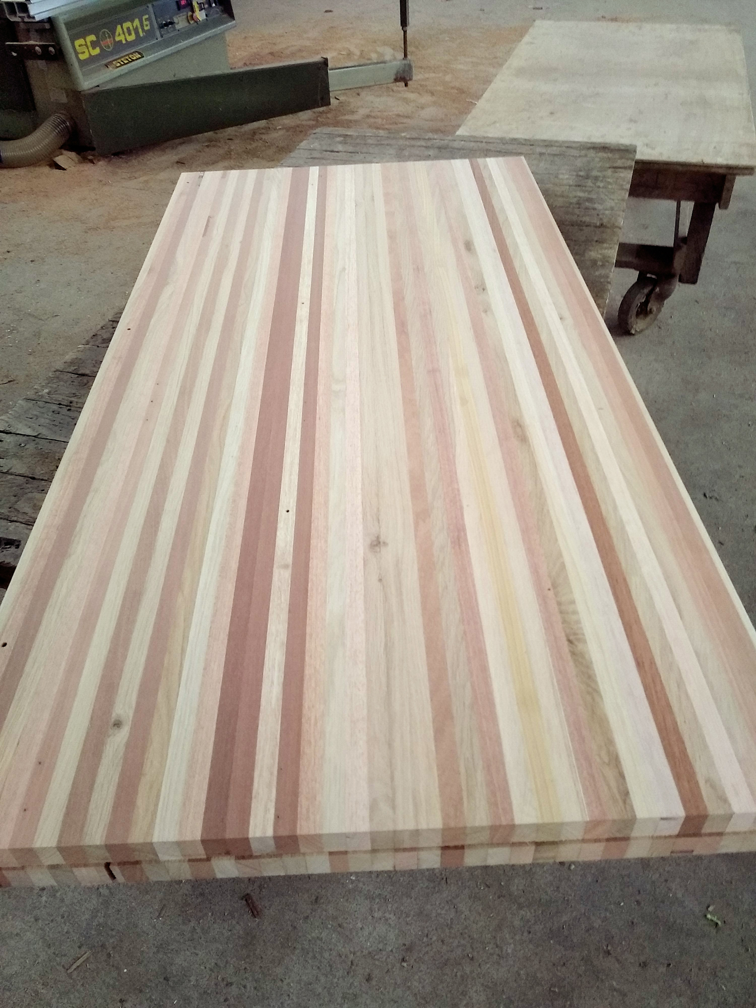 MPa01 Le mode de fabrication des panneaux en lamellé-collé permet d’utiliser des bois de différentes longueurs en les aboutant. Les tasseaux sont combinés en alternant les essences. Les plateaux en lamellés-collé peuvent être installés dans des bureaux, comme plans de travail de cuisine ou encore dans des salles de bain.