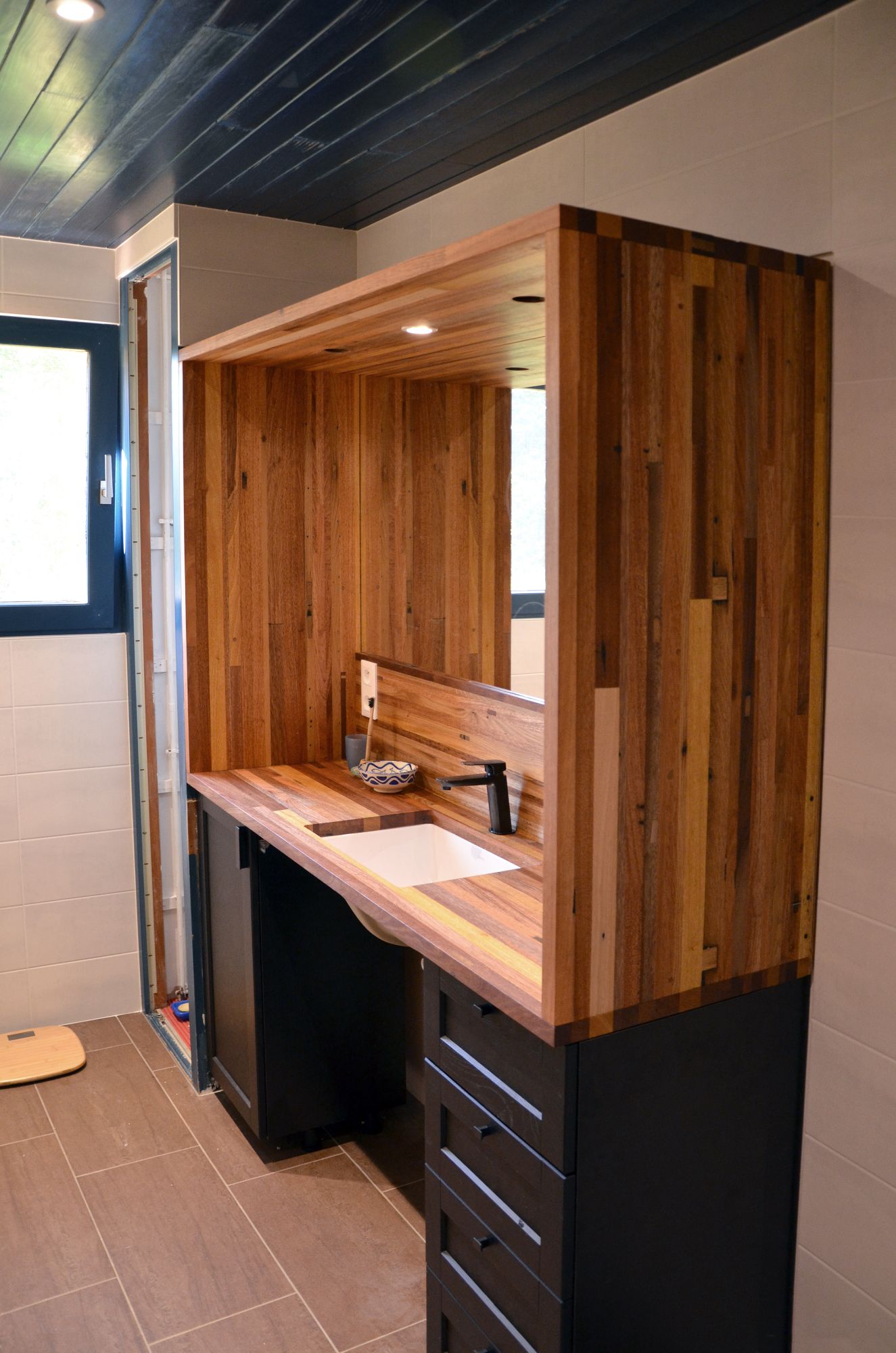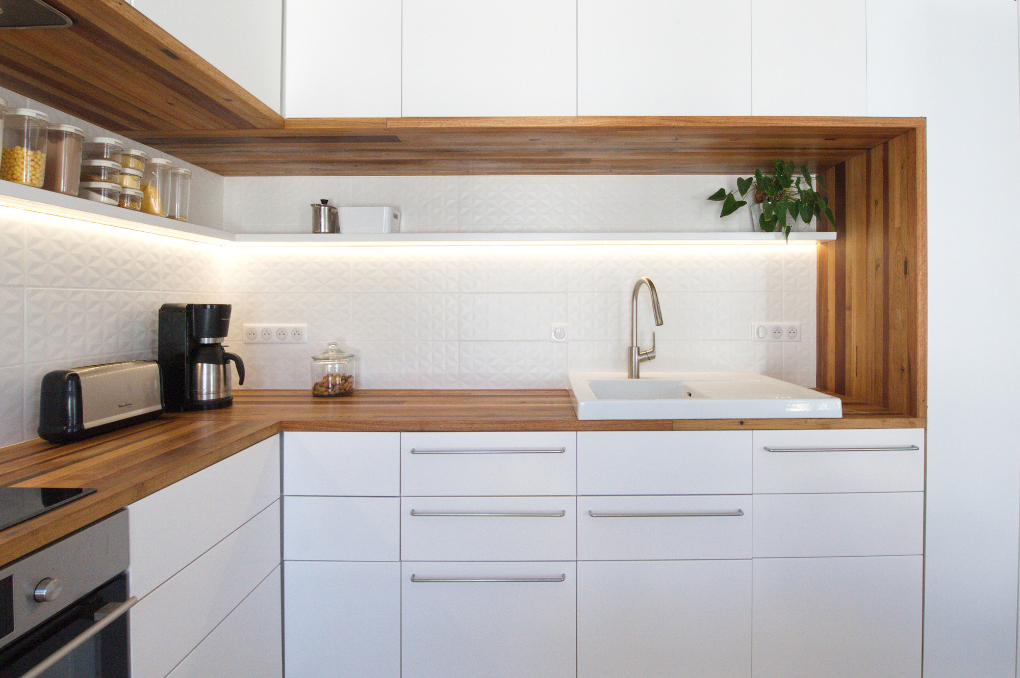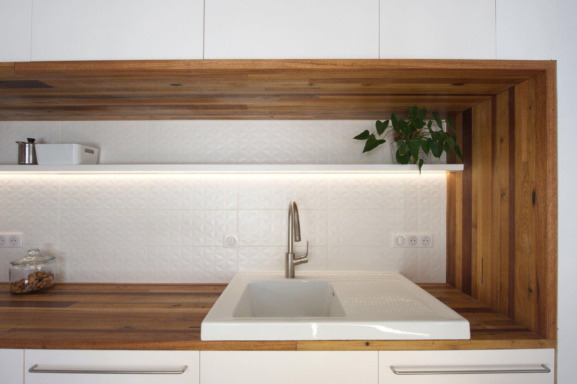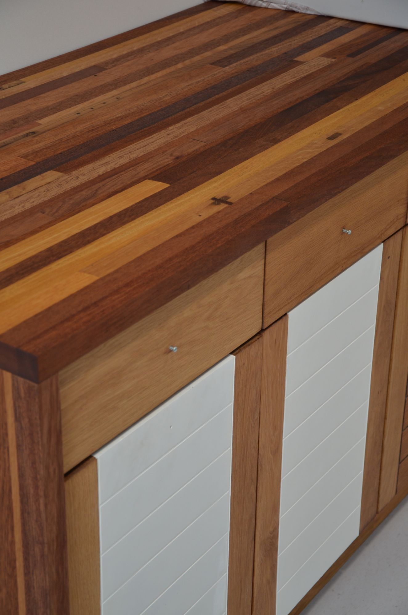 MPa01 Le mode de fabrication des panneaux en lamellé-collé permet d’utiliser des bois de différentes longueurs en les aboutant. Les tasseaux sont combinés en alternant les essences. Les plateaux en lamellés-collé peuvent être installés dans des bureaux, comme plans de travail de cuisine ou encore dans des salles de bain.