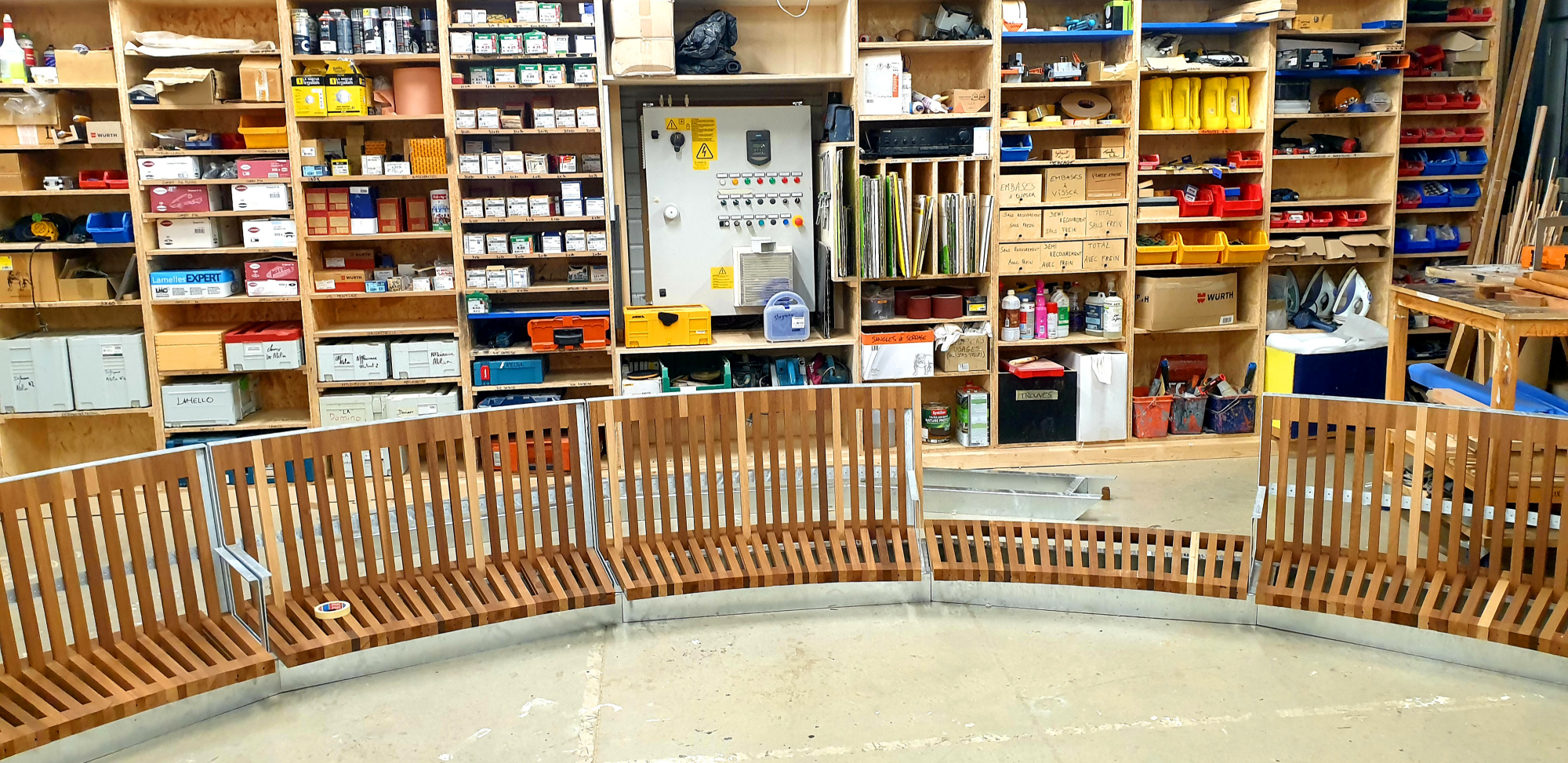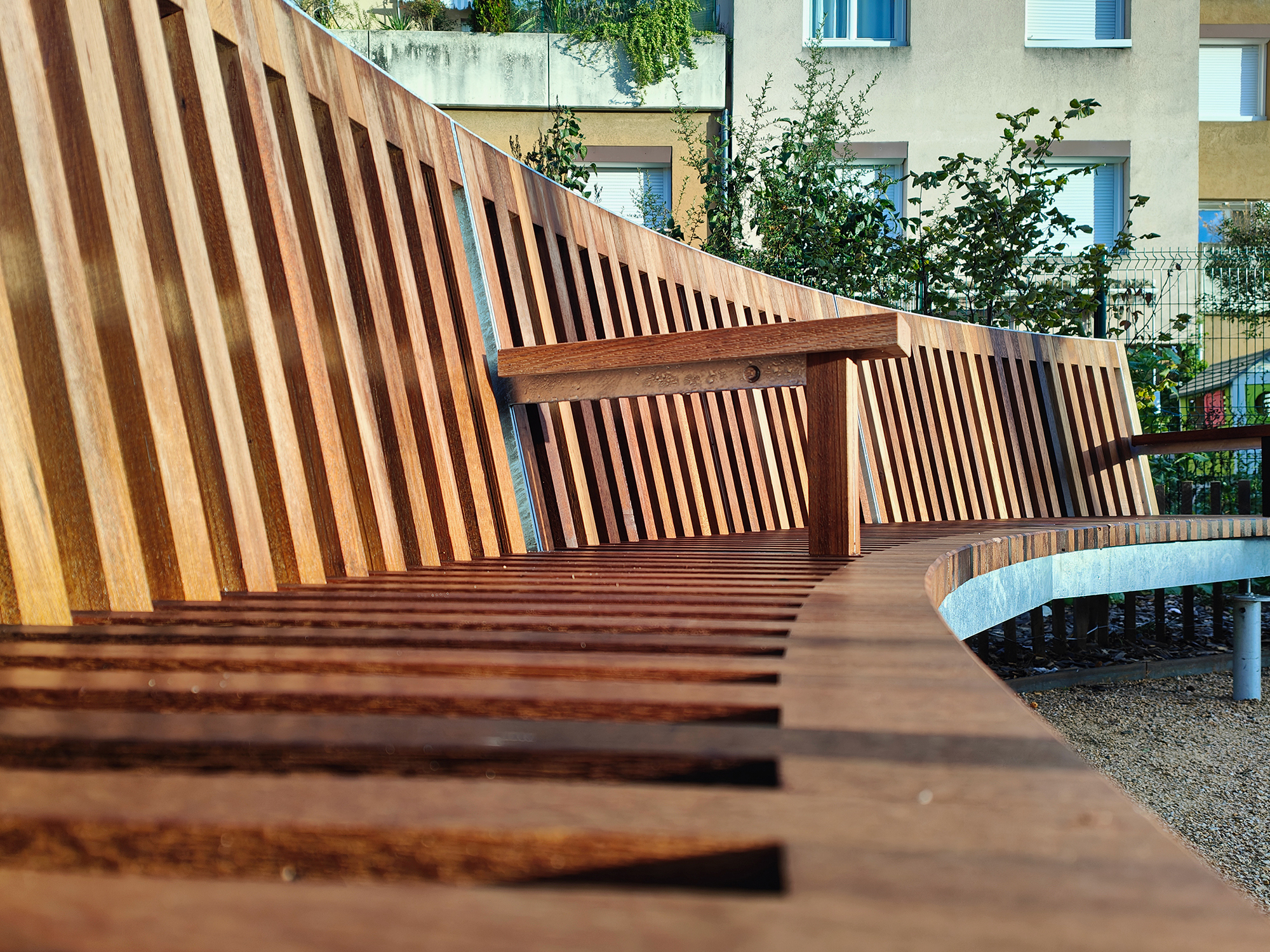 Le banc des Cigales, EBa01-m, est fabriqué en chêne et bois tropical réutilisé, de classe d’usage 3 et 4 provenant d’anciennes menuiseries. Il s’agit, ici d’une variante du banc EBa01 (tronçons droits ou circulaire), traitée en charpente métallique et posée sur vis de sol Weasyfix.