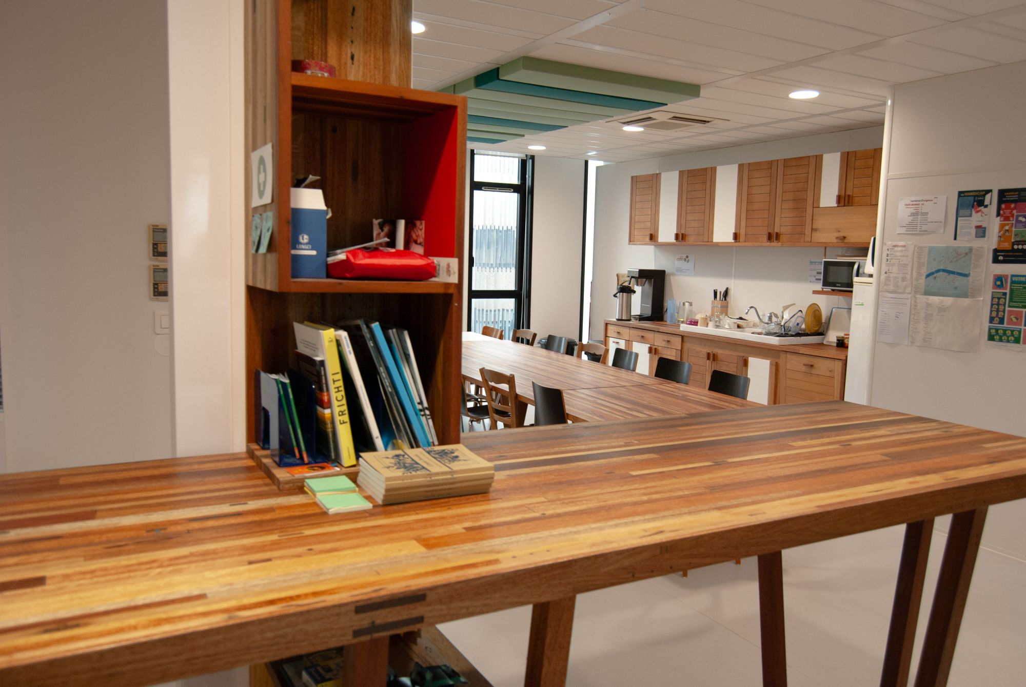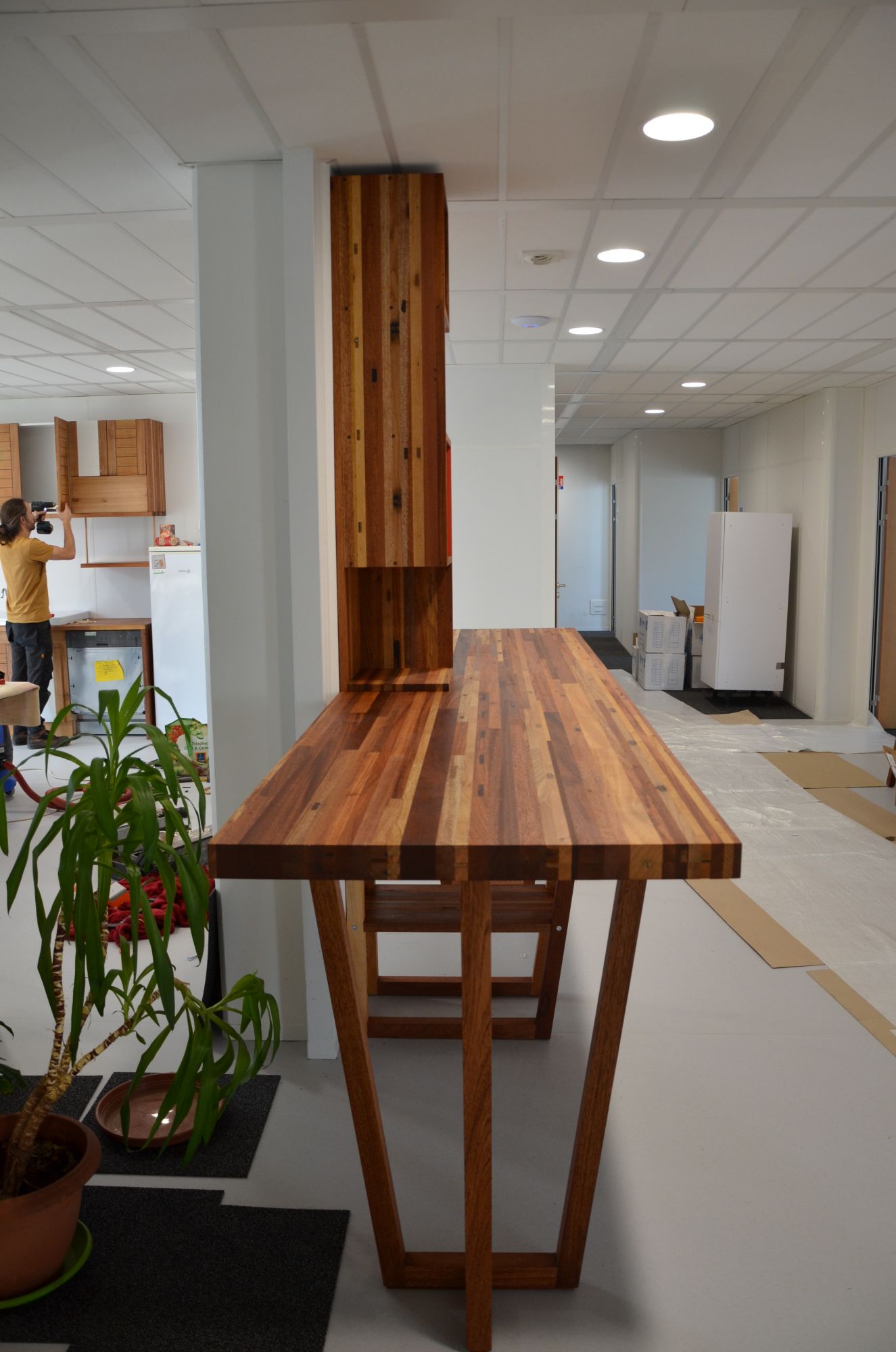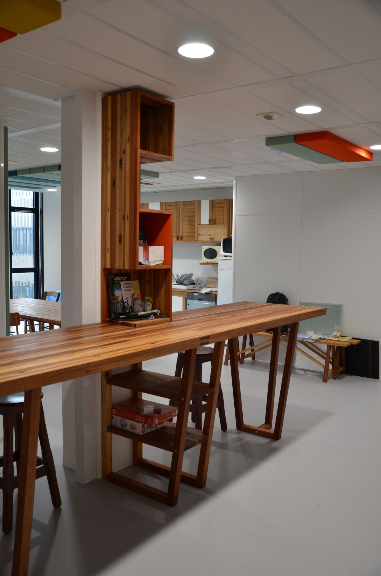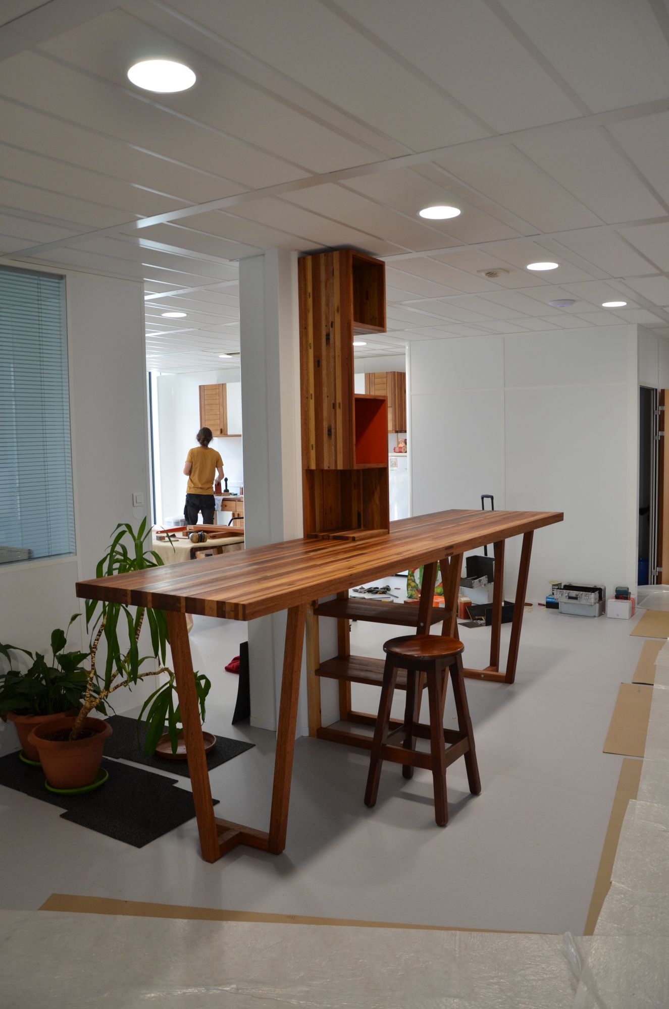 EVEA, bureau d’études spécialisé dans l’analyse de cycle de vie, a ainsi choisi de nous faire réaliser ses agencements intérieurs : cuisine,, table, mange-debout et rangement, banquette méridienne et bibliothèque de démonstration, le tout… 100 % en réemploi !