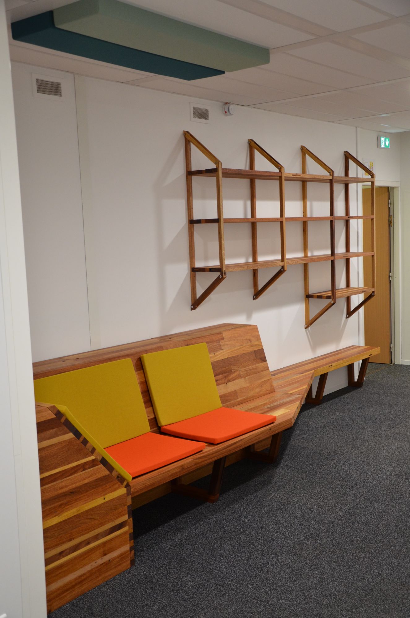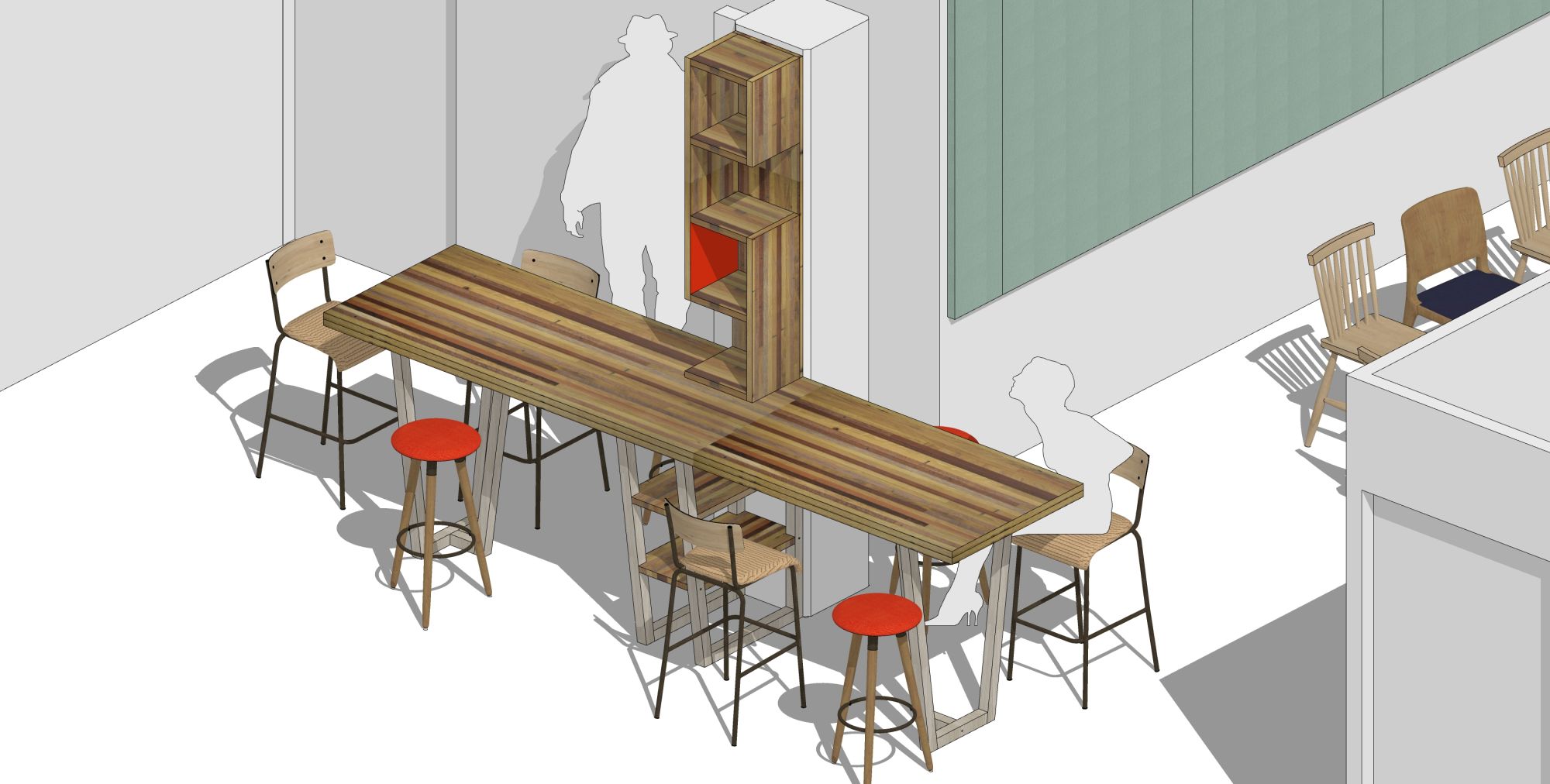 Nous avons été mandaté pour concevoir et fabriquer un ensemble de mobilier cohérent pour apporter chaleur et convivialité à cet espace partagé au sein de l’entreprise :
