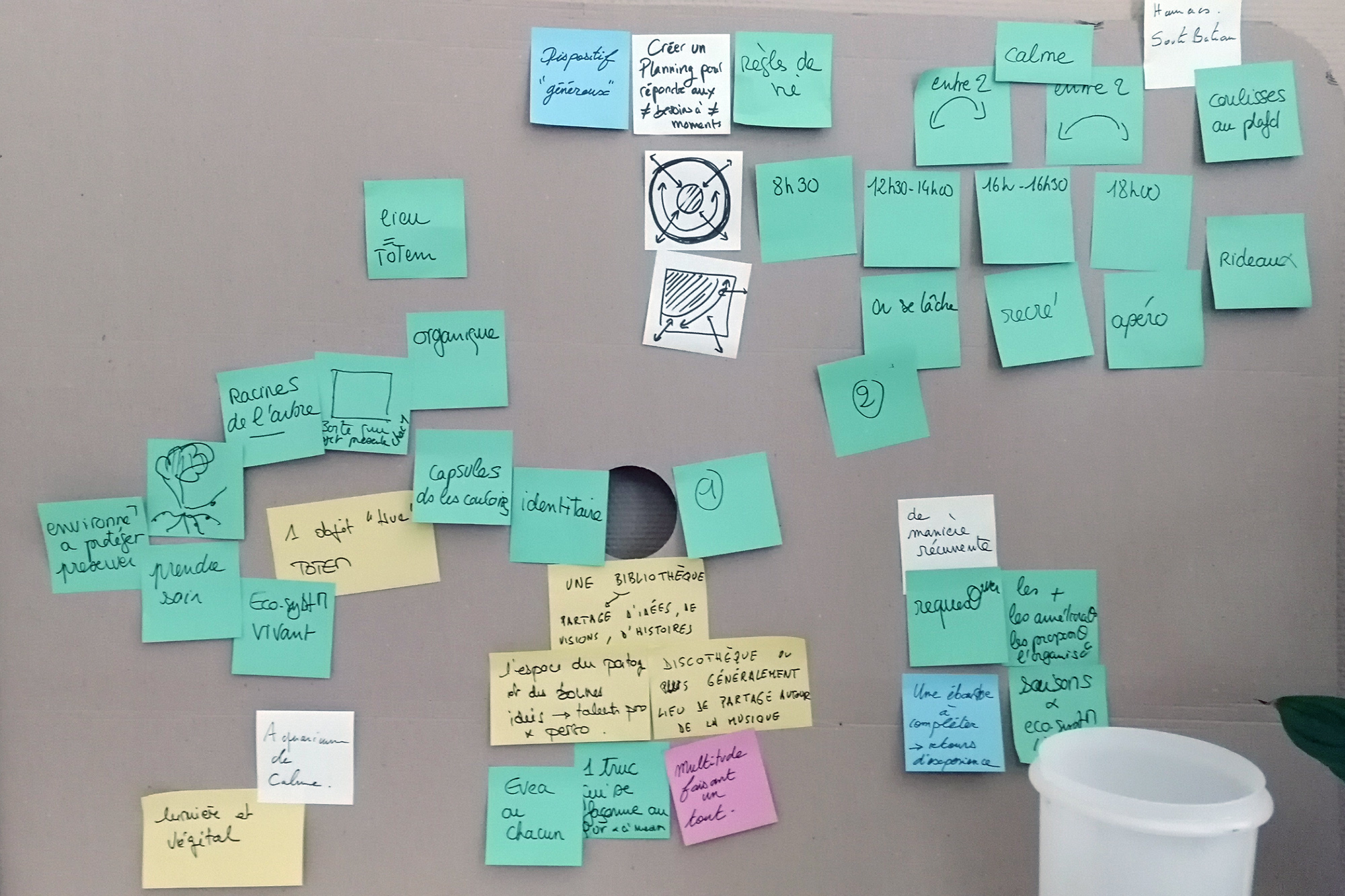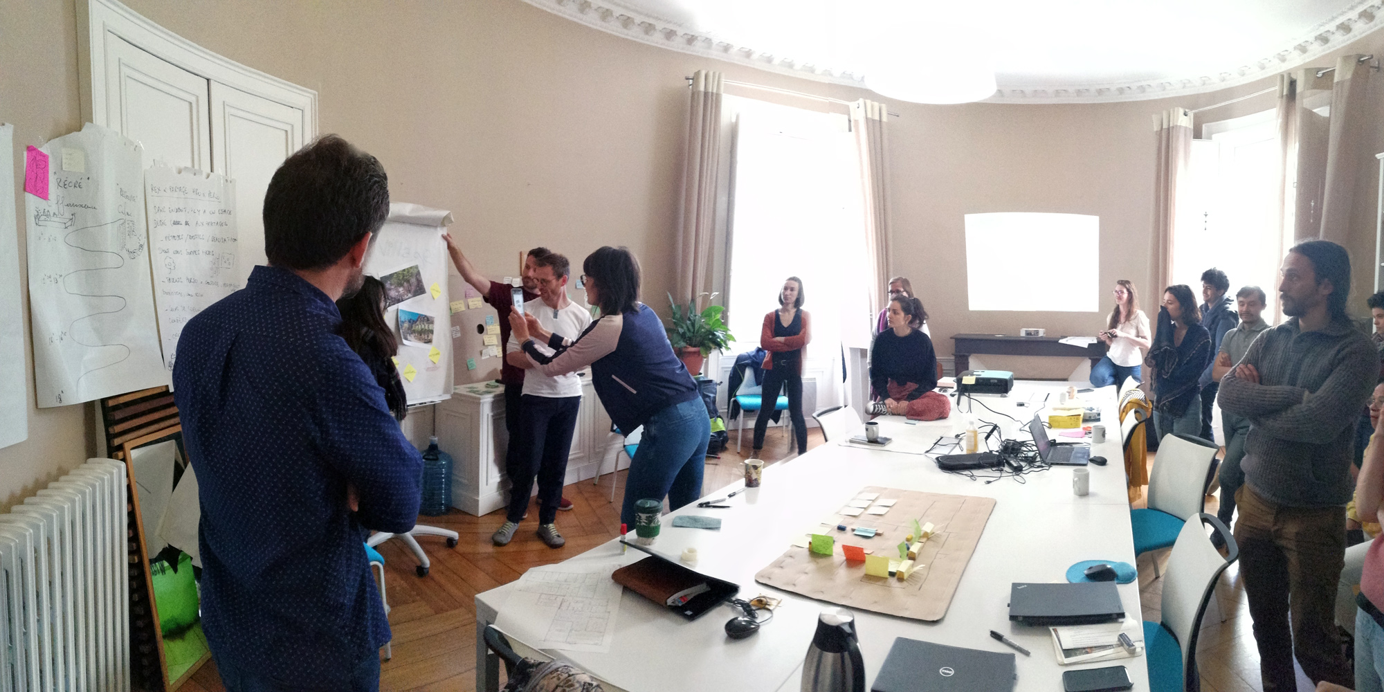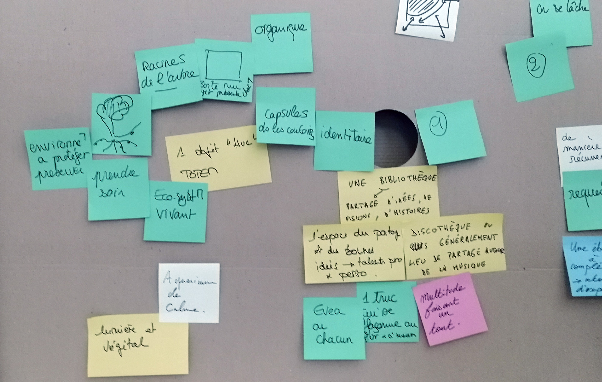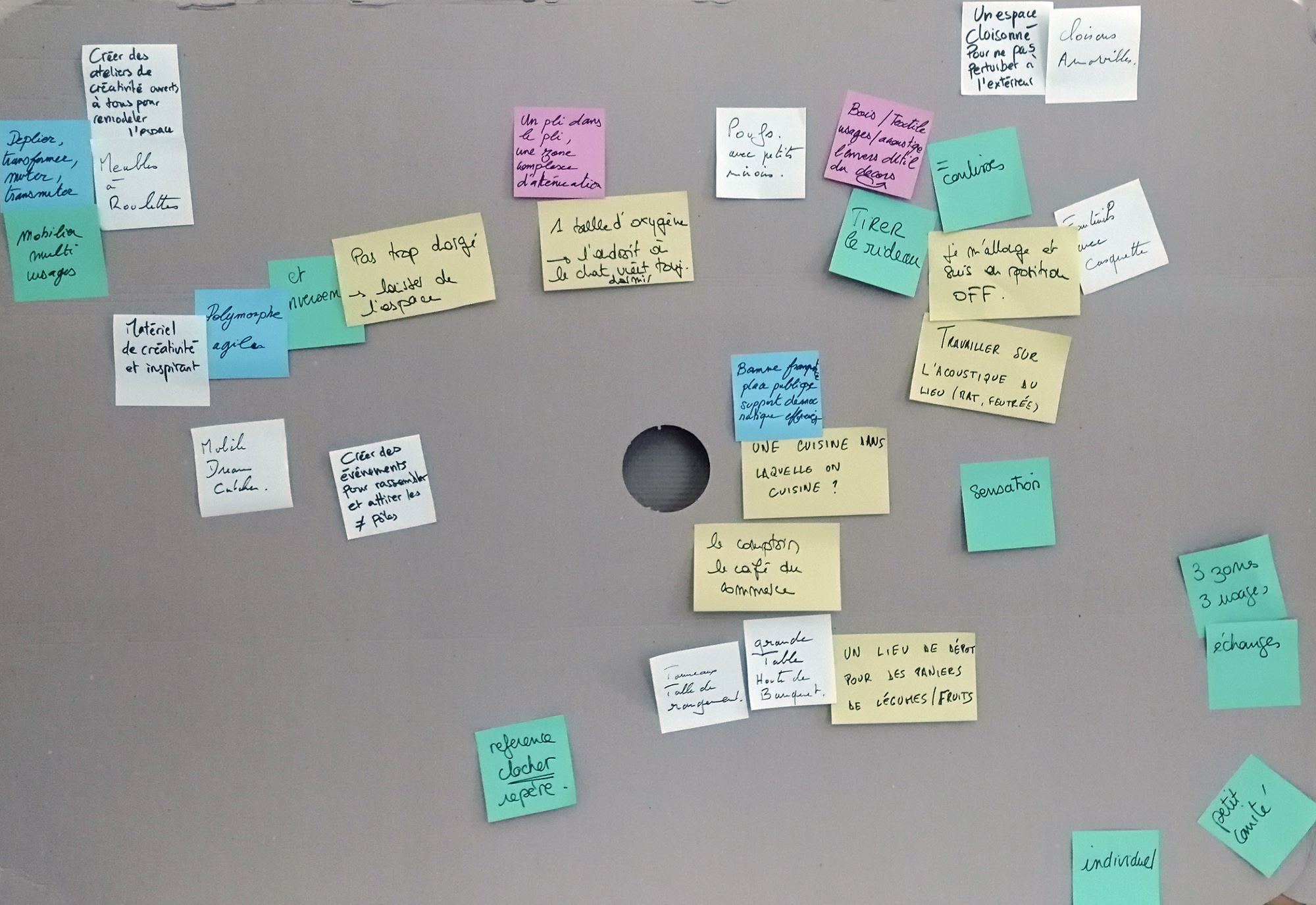 Ce projet a commencé avec des ateliers de co-design avec les employés des différents pôles de l’entreprise, pour définir des enjeux d’espace et d’ambiance (merci à Violaine Penelon et Maud Blondel pour l’animation des ateliers de codesign) ; et abouti à un ensemble mobilier enveloppant, de bois métissés, se déclinant en différentes formes accueillantes pour les usages de l’entreprise.