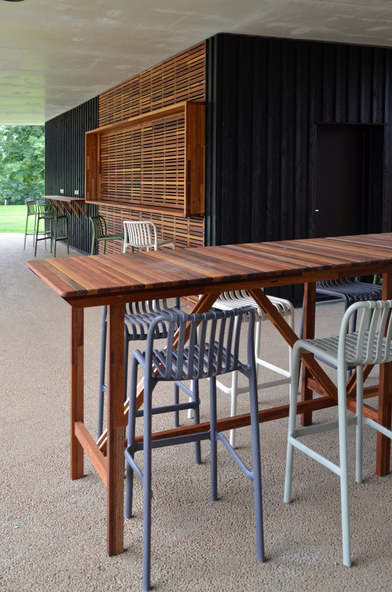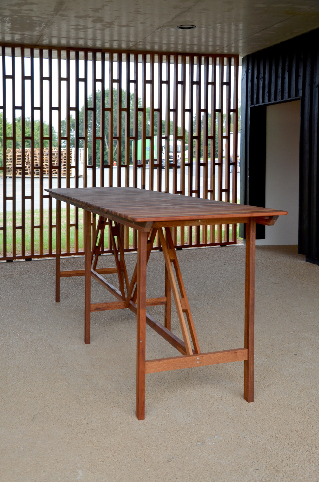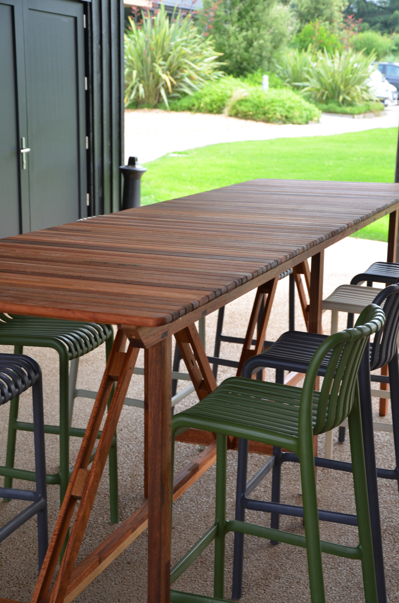 Le mange-debout LMd01 est une grande table de convivialité à hauteur de bar. Ses grandes structures en compas lui confère un caractère aérien. Il est conçu sur la même ligne que la table LTa02 et le banc LBa02, et peut être commandé en version indoor (en bois de classe d’emploi 1 & 2), ou outdoor (en bois de classe d’emploi 3 & 4).