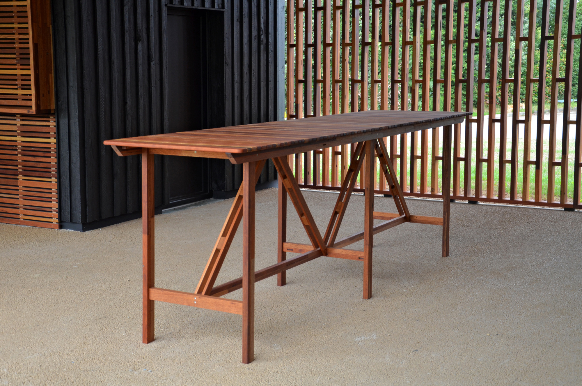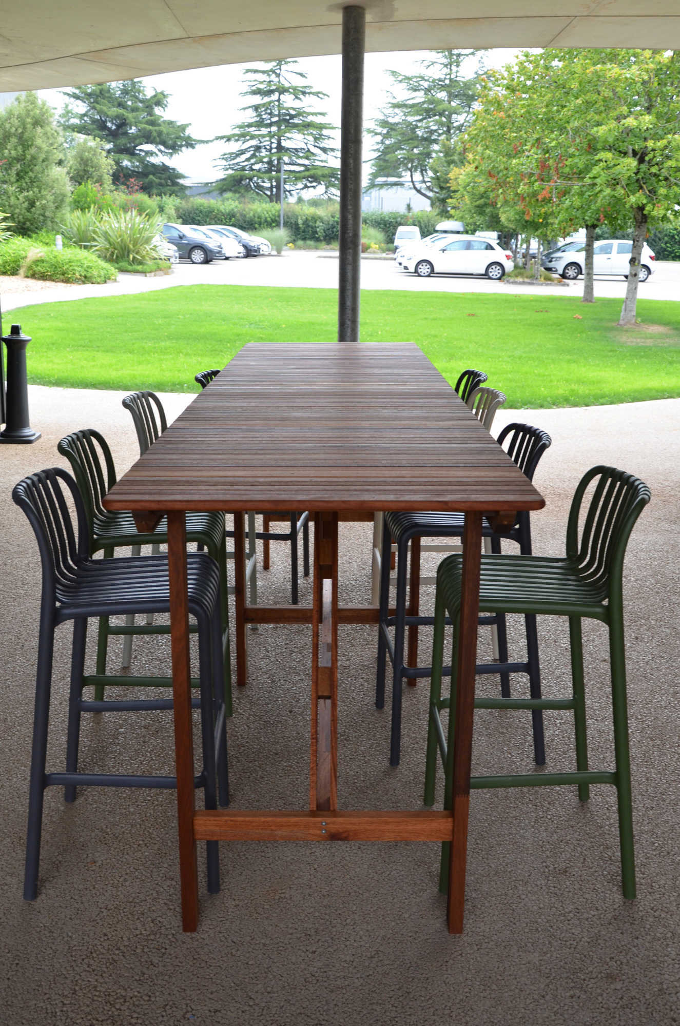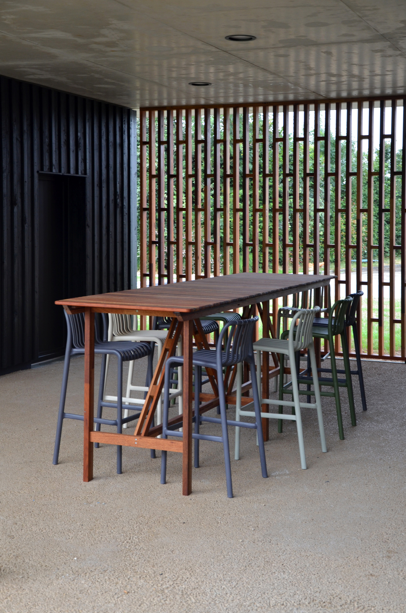 Le mange-debout LMd01 est une grande table de convivialité à hauteur de bar. Ses grandes structures en compas lui confère un caractère aérien. Il est conçu sur la même ligne que la table LTa02 et le banc LBa02, et peut être commandé en version indoor (en bois de classe d’emploi 1 & 2), ou outdoor (en bois de classe d’emploi 3 & 4).