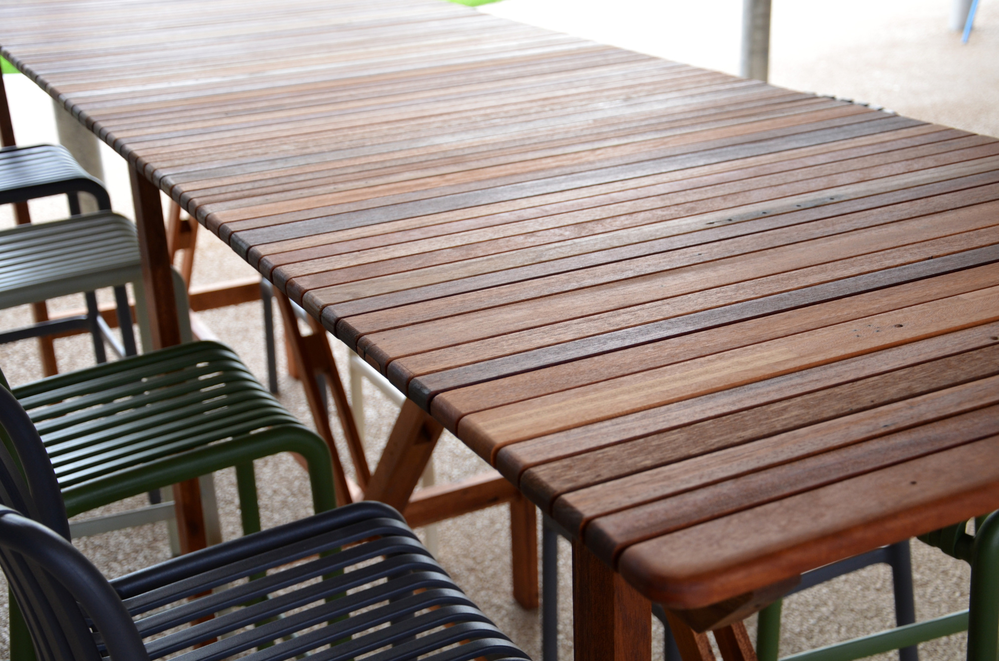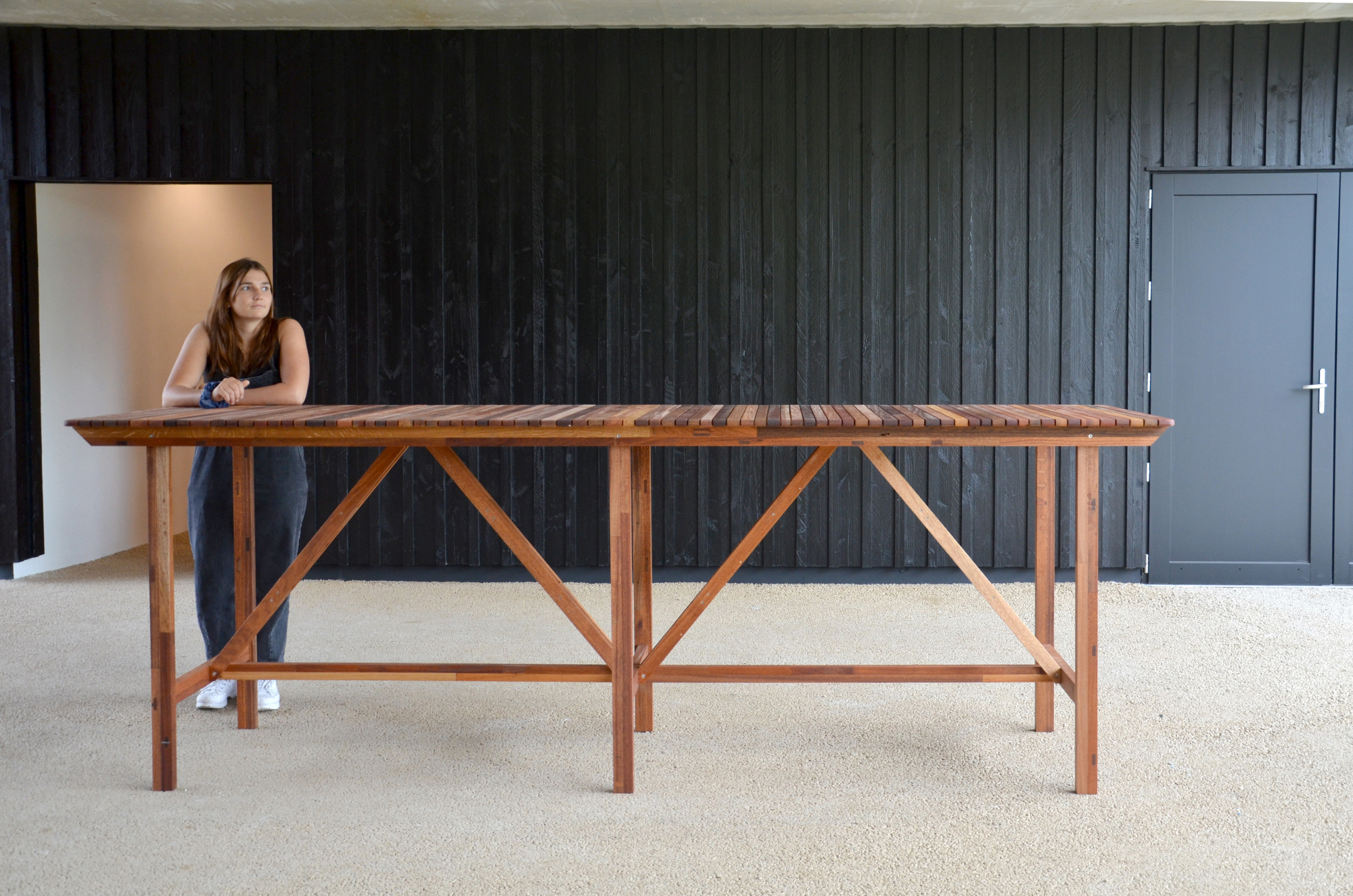 Le mobilier est livré à plat et est assemblé grâce à des inserts métalliques. Il peut être commandé en finition brute, ou bien en finition huilée (comme ici). Le mobilier est idéal pour les terrasses d’entreprises, les coworking ou tiers lieux.