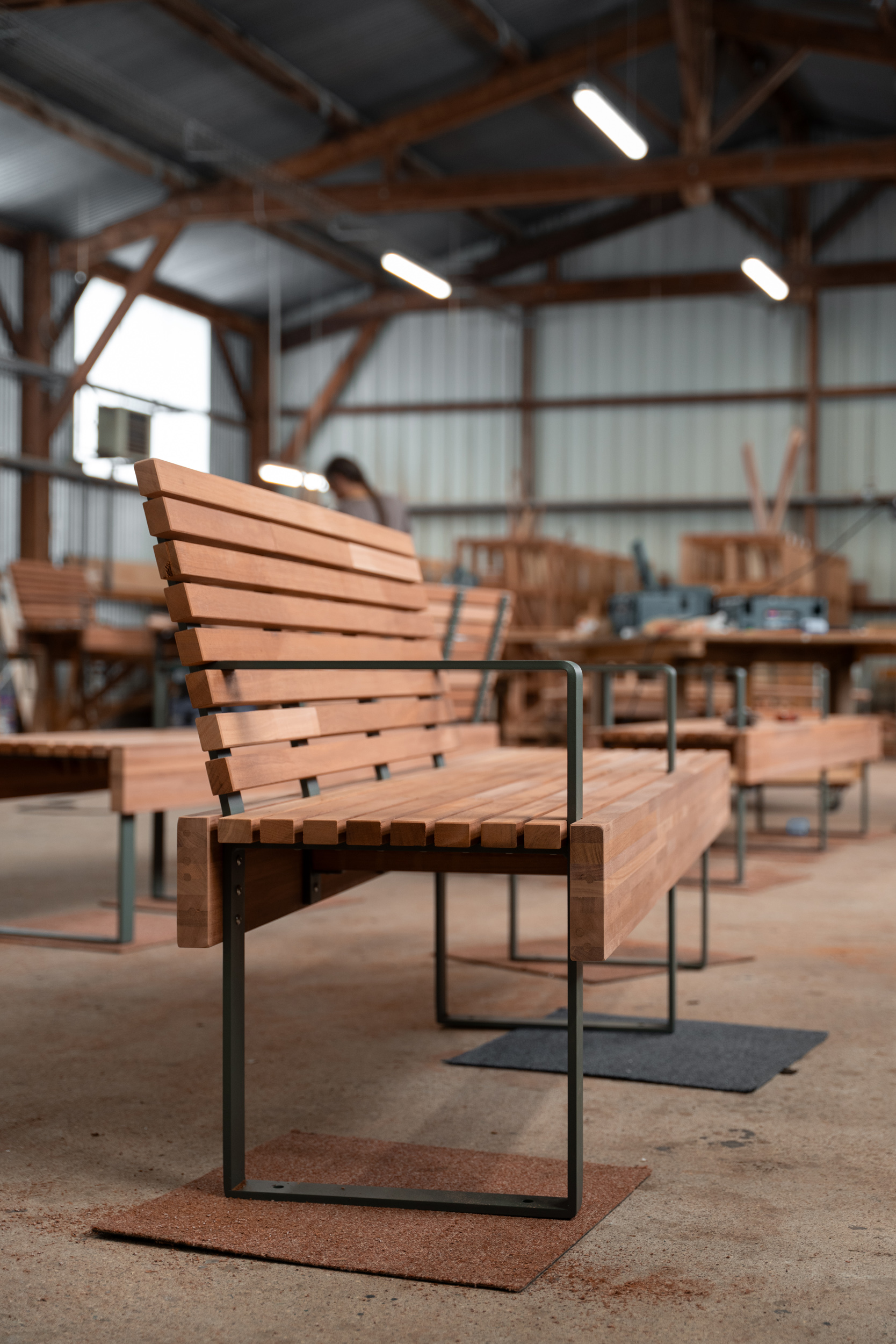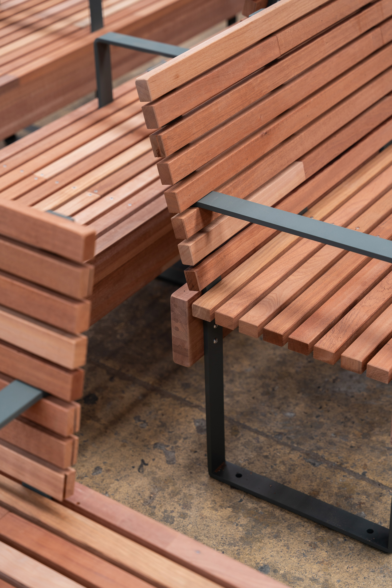 Le modèle se décline en bancs avec ou sans dossiers, avec ou sans accoudoirs.
