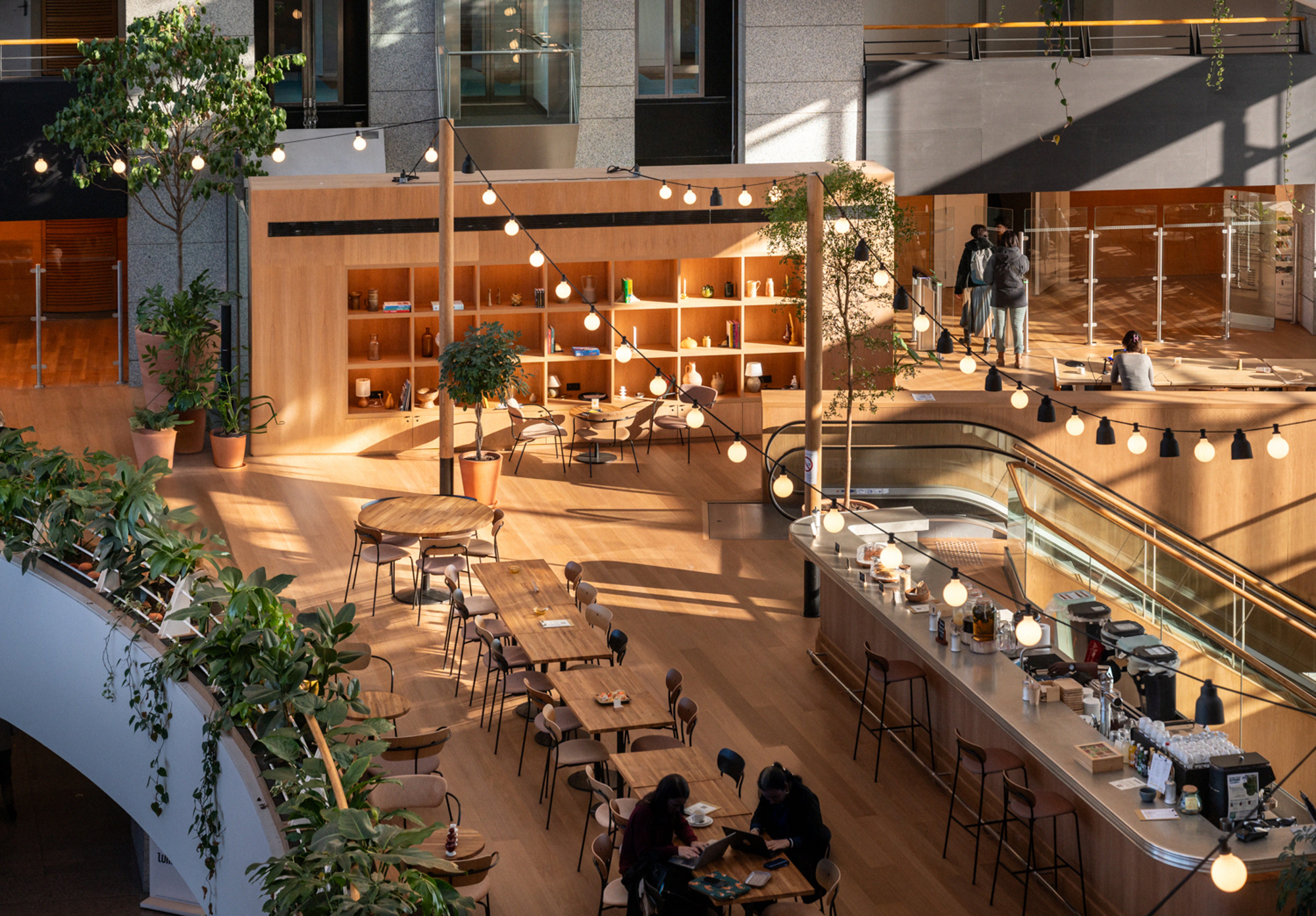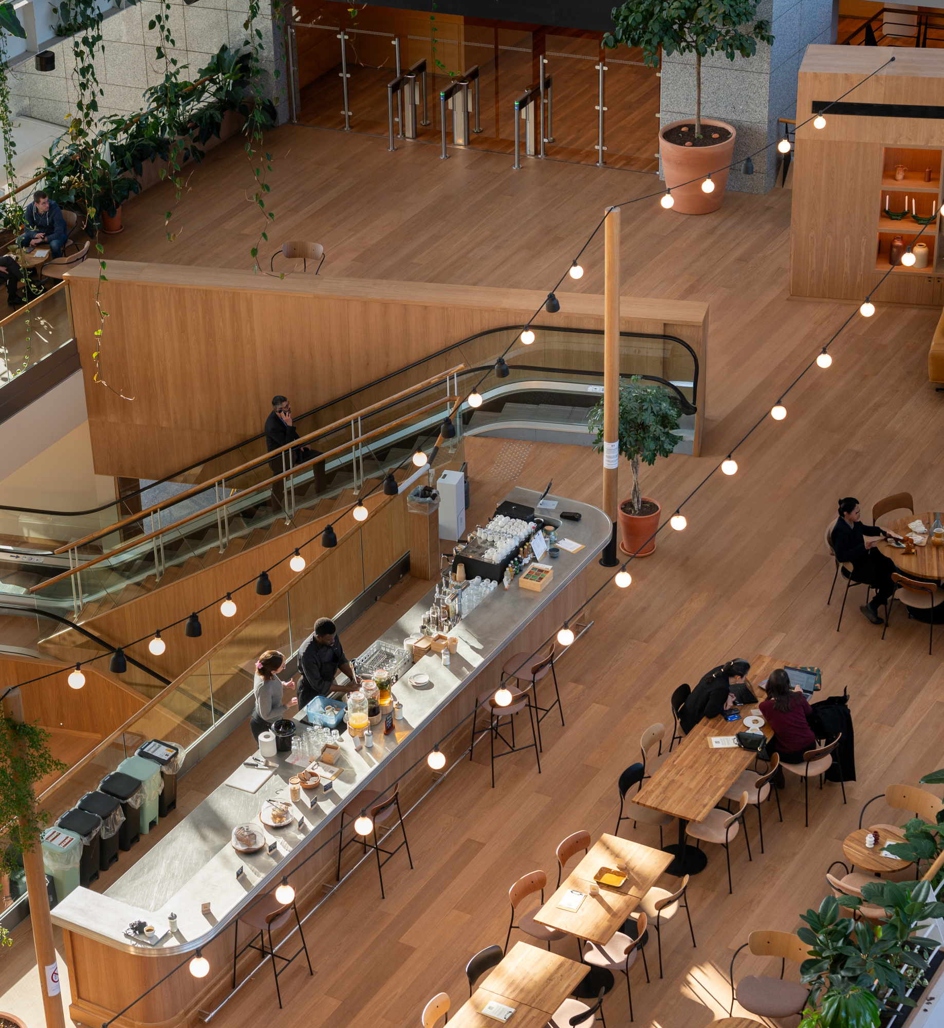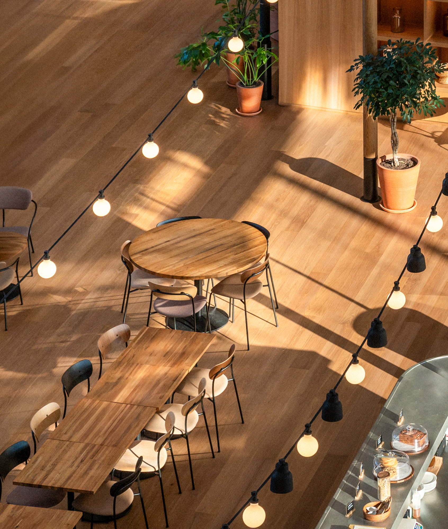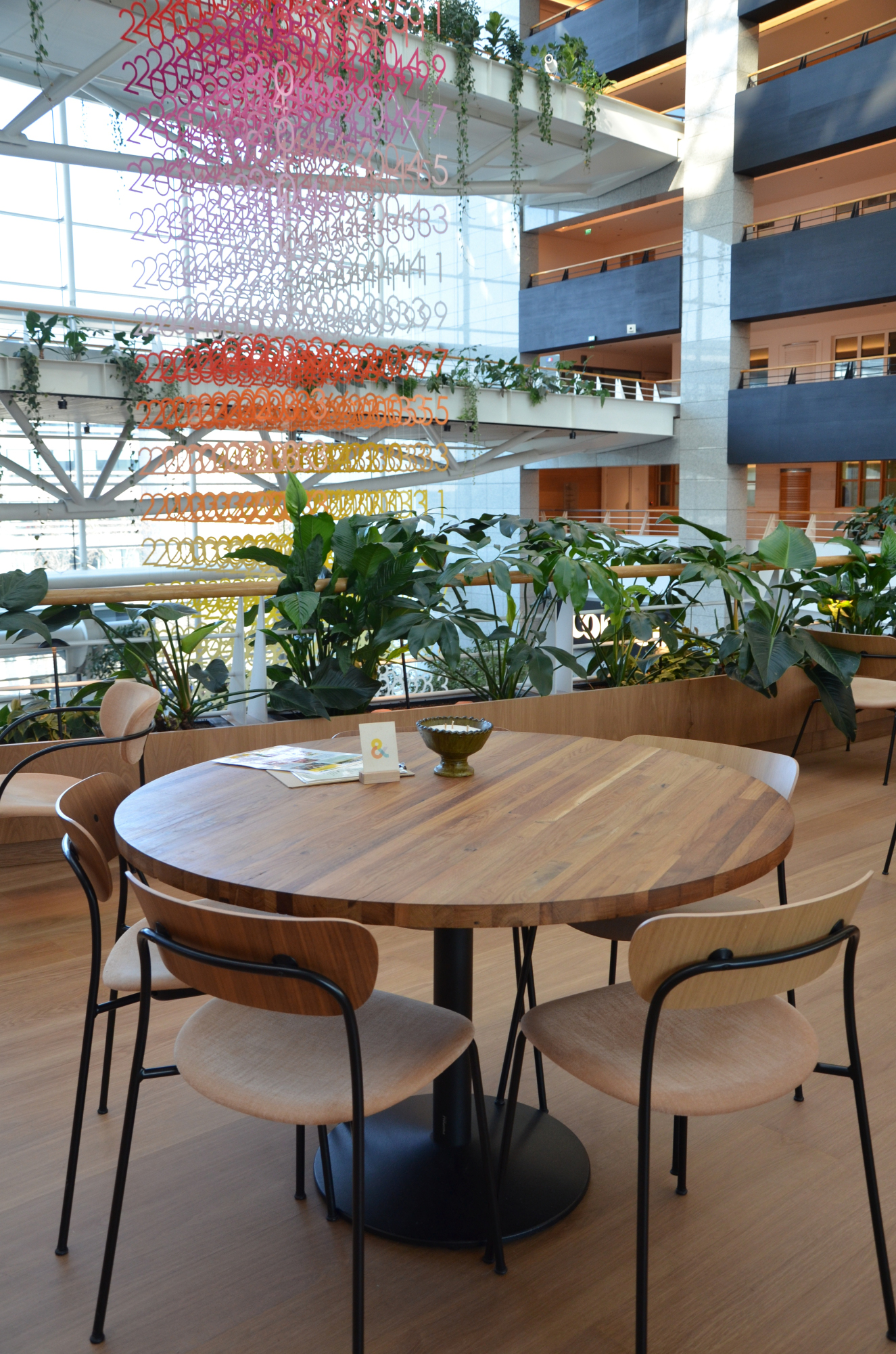 Réalisation de plateaux de tables de restauration pour l’aménagement de l’atrium de l’immeuble Lumière à Bercy. 100 Détours a été mandaté par RAAM Architectes pour concevoir et fabriquer des tables en bois de réutilisation d’anciennes menuiseries extérieures. Le métissage d’essence, issu de notre ressource, renforce l’ambiance chaleureuse qui réside dans cet espace de convivialité.